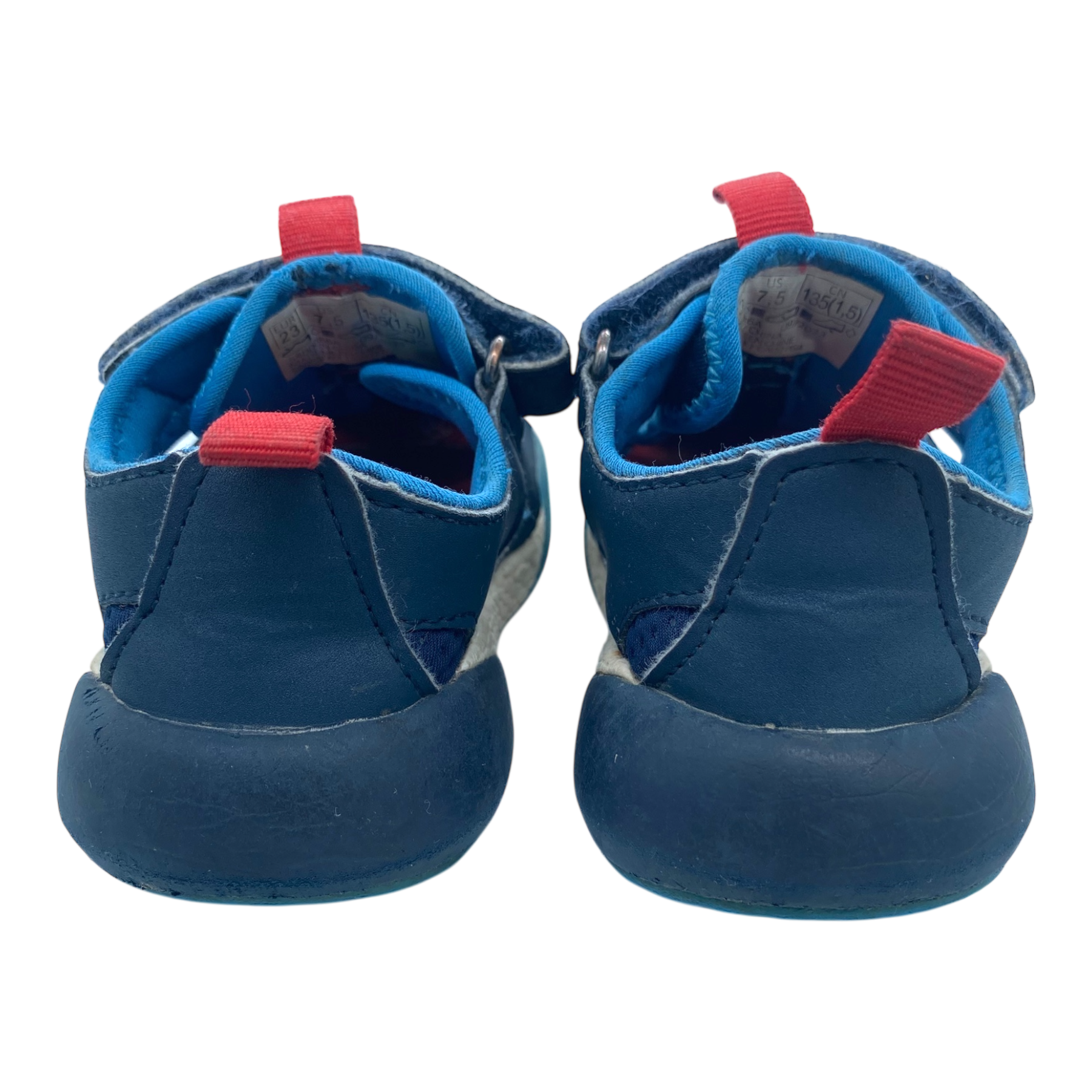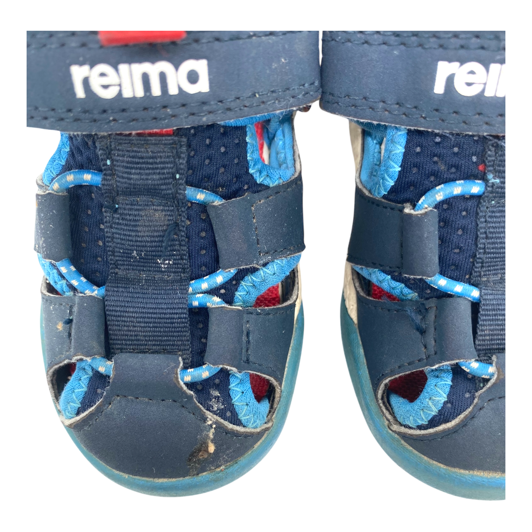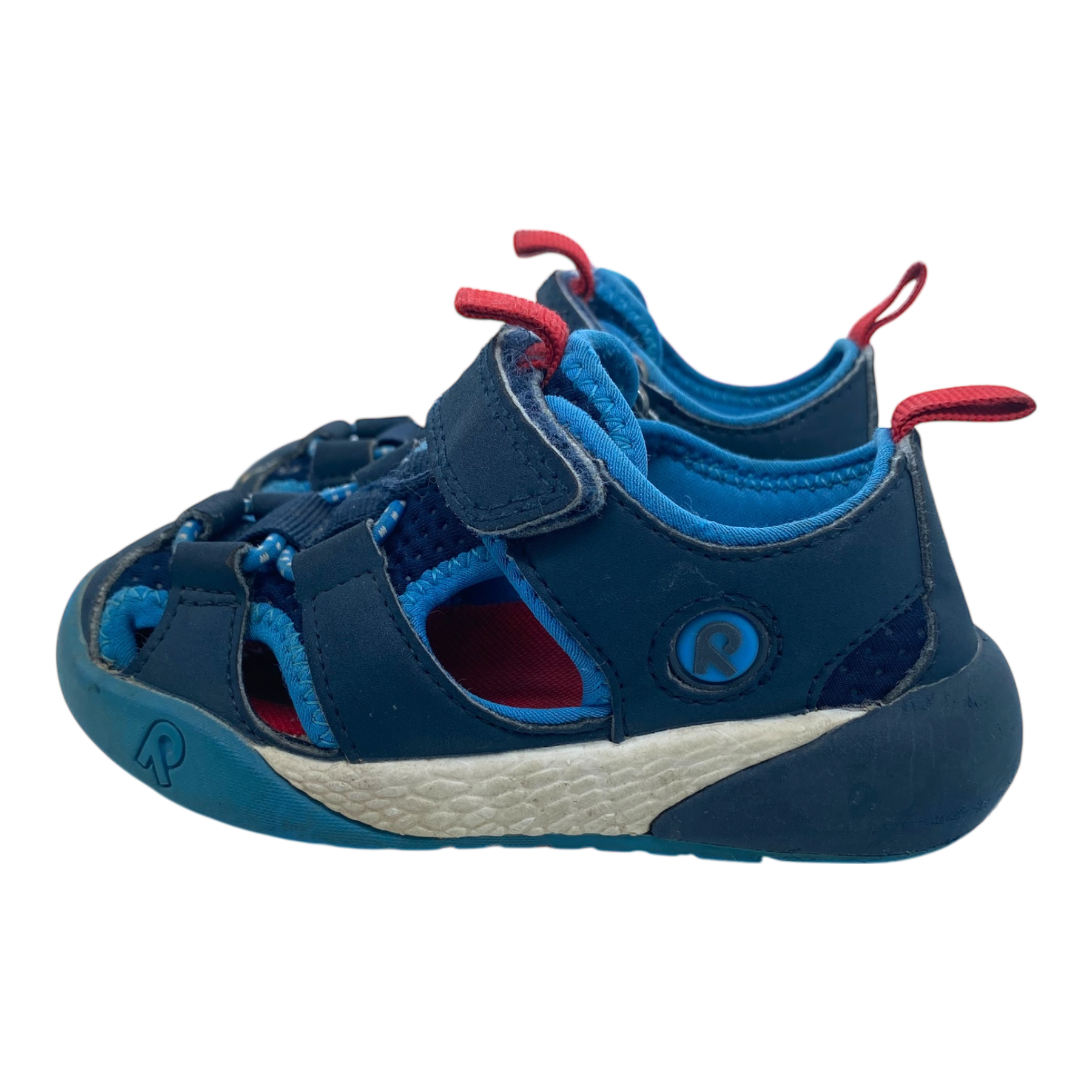 Reima Lomalla sandals with a soft textile top part and a velcro strap for easy dressing. Shoes have some visible stains, which are probably washable.