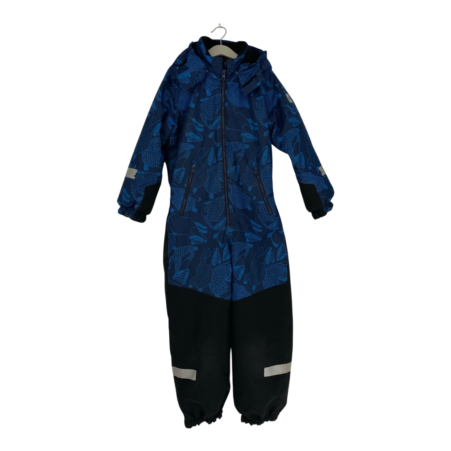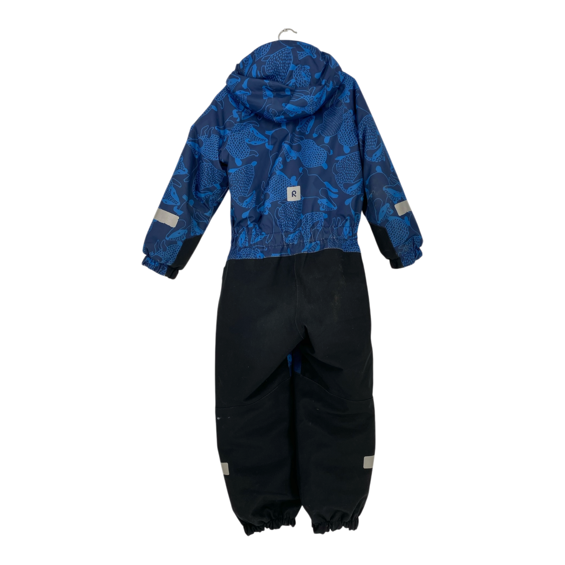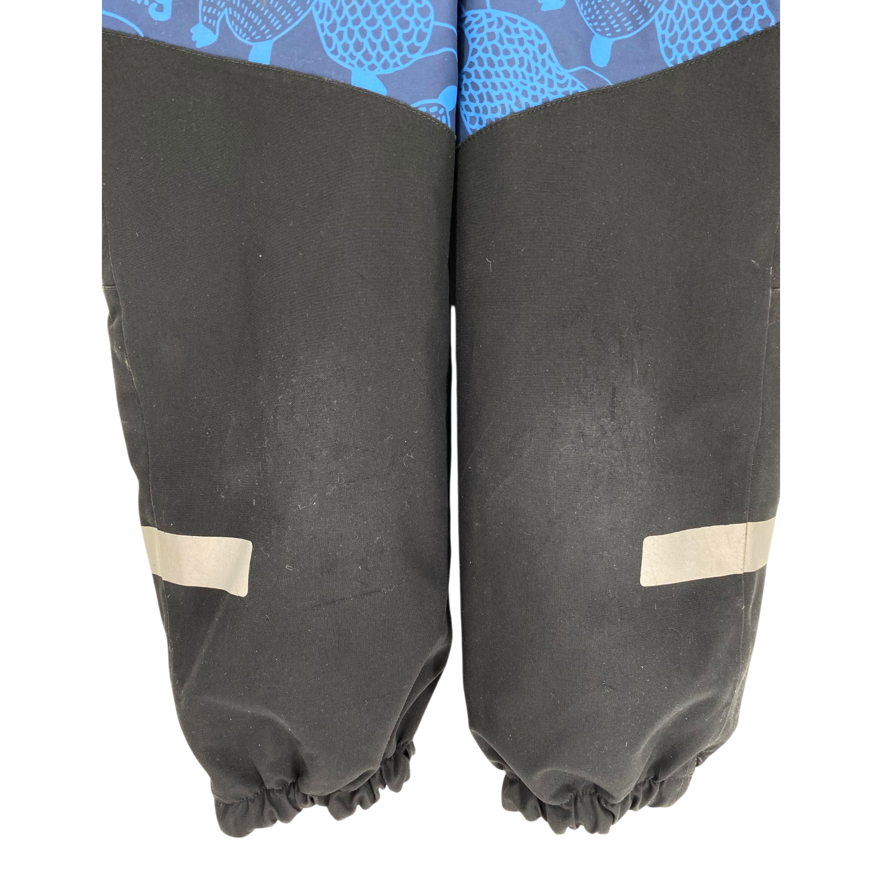 Reima Snowstorm overall with a detachable hood and zip pockets on the sides. The material is originally waterproof up to 10,000mm water column, windproof, and breathable. All seams have been sealed. Durable reinforcements on the bottom, knees, and hems. The silicone foot loops keep the leg ends in place, no matter how fast your little one's moving.