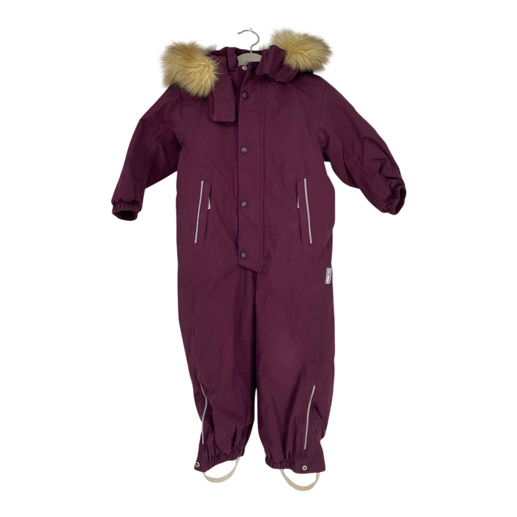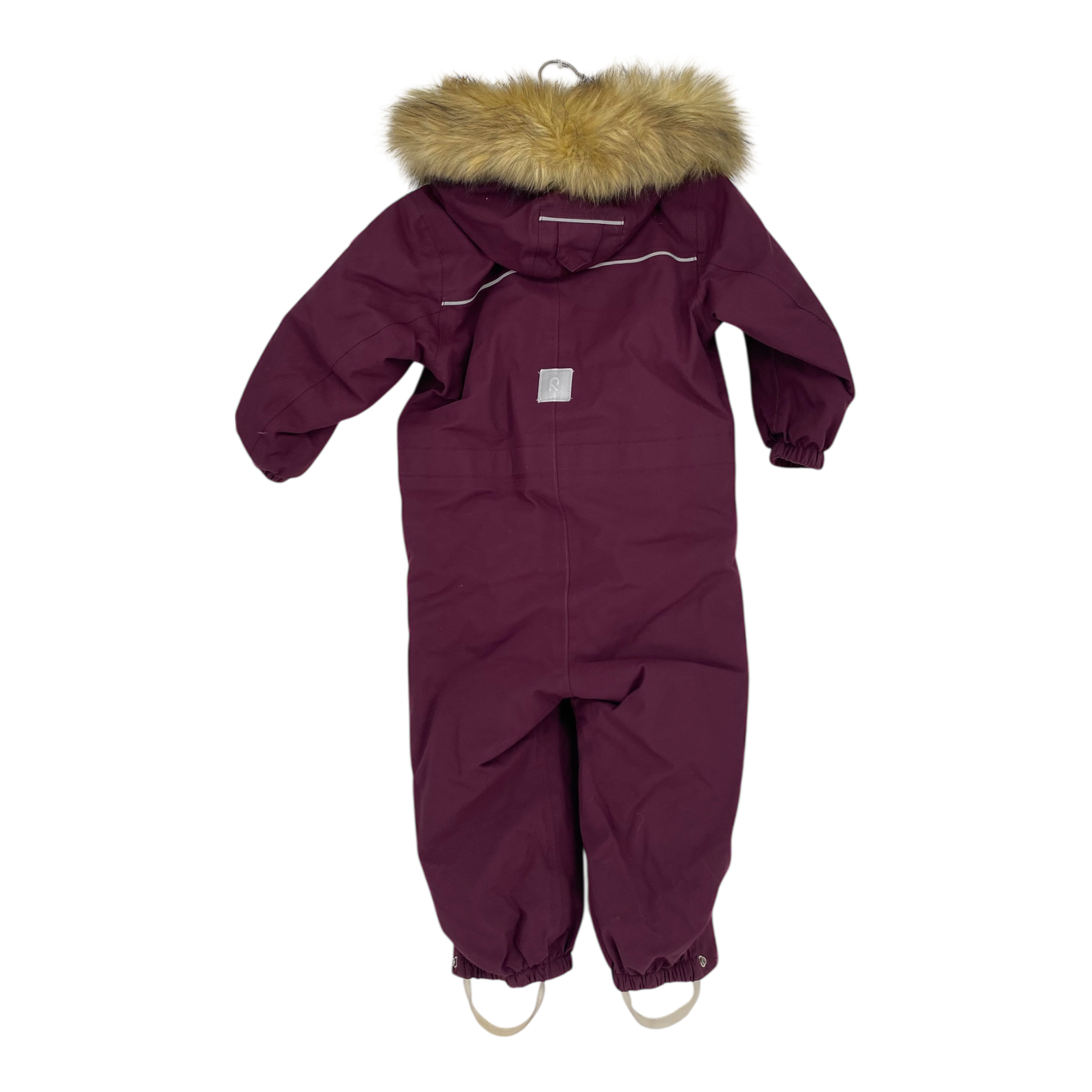 Reima Stavanger winter overall with zip closure, detachable faux fur hood, two zip pockets, reflective details, durable foot loops, and adjustable elastic on the waist. The fabric is strong, waterproof yet breathable material. The material is originally waterproof up to 10,000mm water column, and all the seams are sealed.