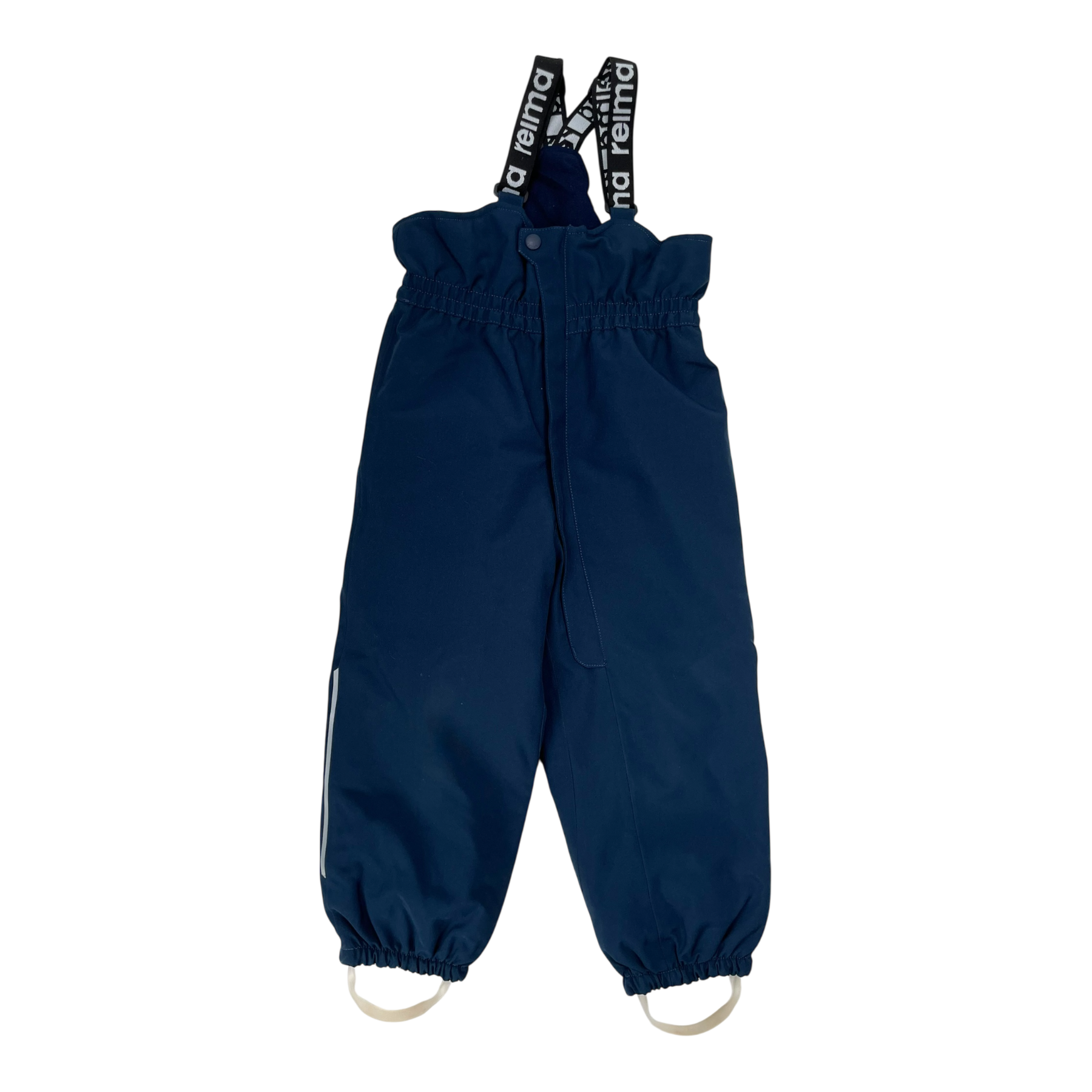 Reima Stockholm padded winter pants with adjustable elastic suspenders and an elastic waist. Pants have a long zip closure and durable foot loops. Material is originally wind- and waterproof.