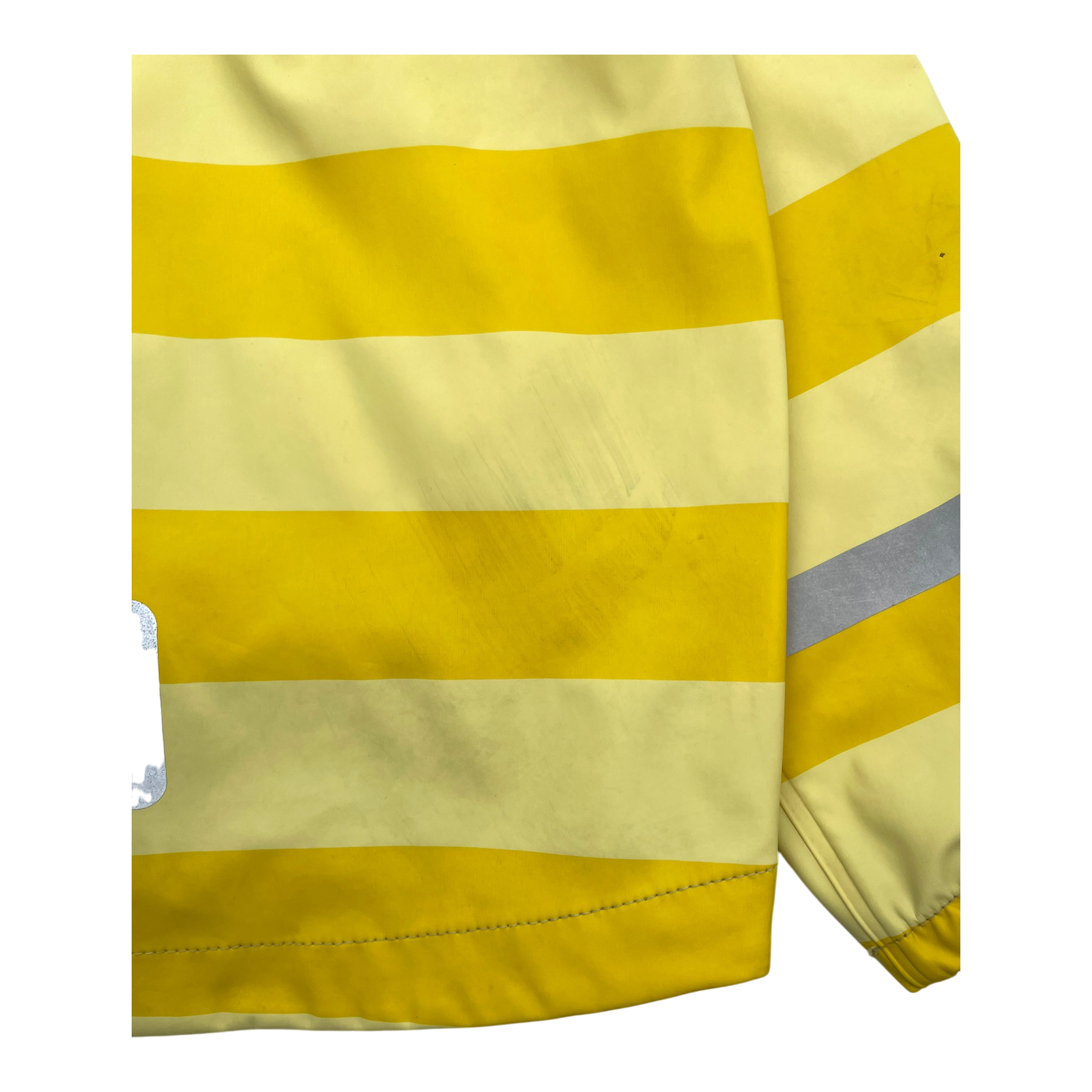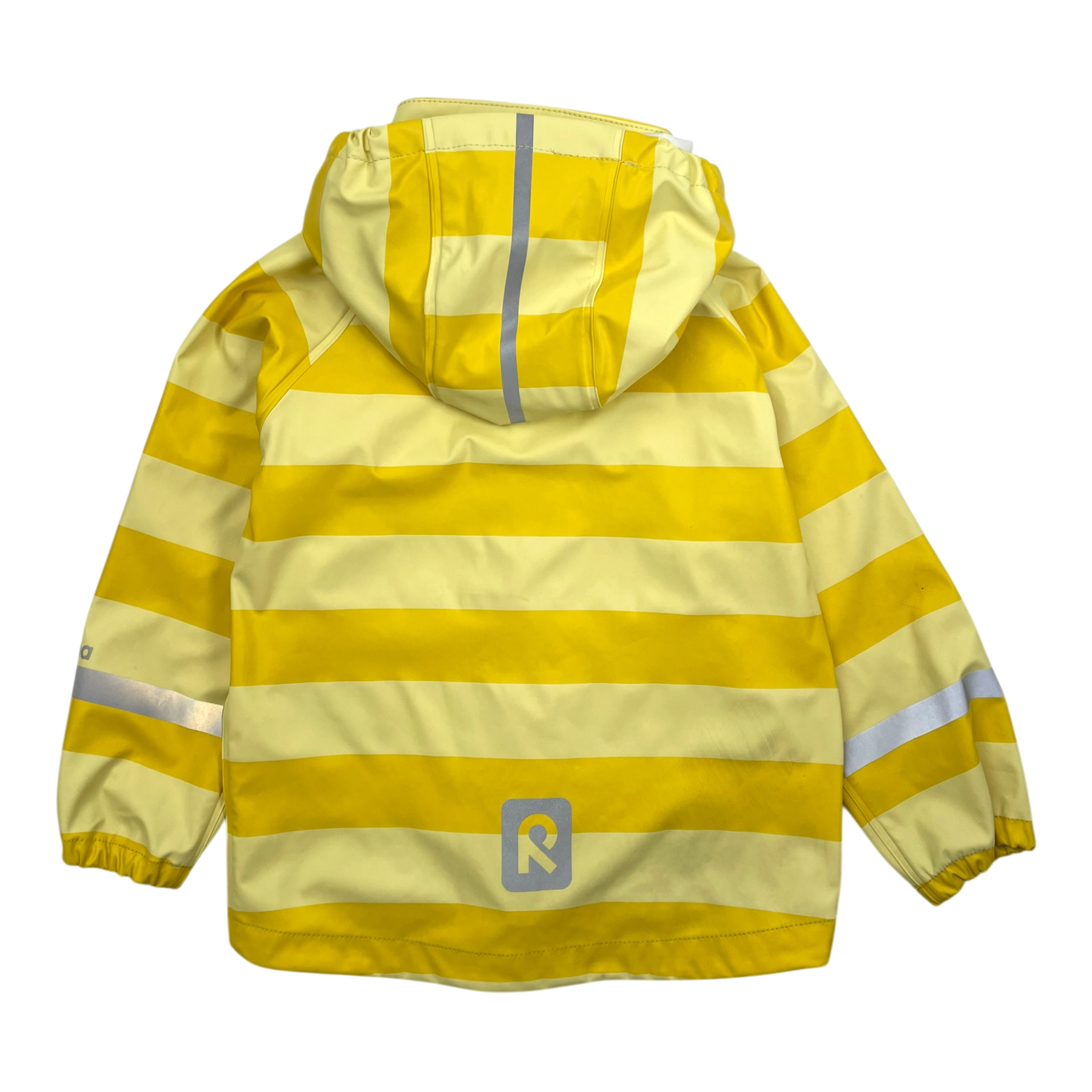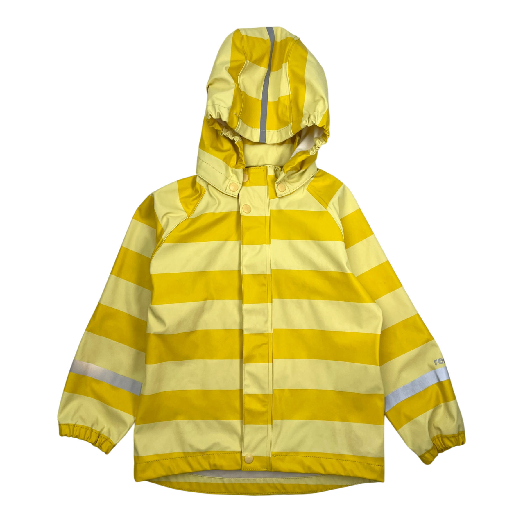 Reima Vesi rain jacket for kids with safe detachable hood. A full-length zip front and lots of reflective details complete the look.
