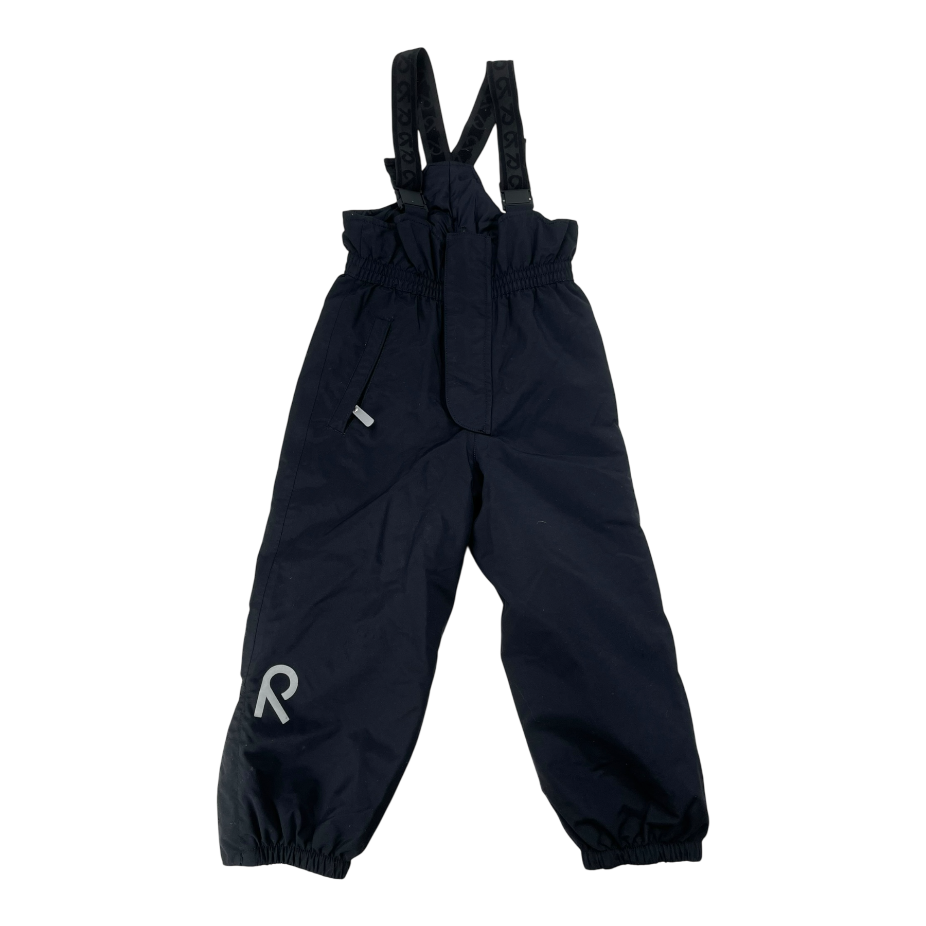 Reima padded winter outdoor pants with adjustable elastic suspenders and elastic waist. Long zip closure, durable foot loops and reflective details. In this item the foot loops are missing.