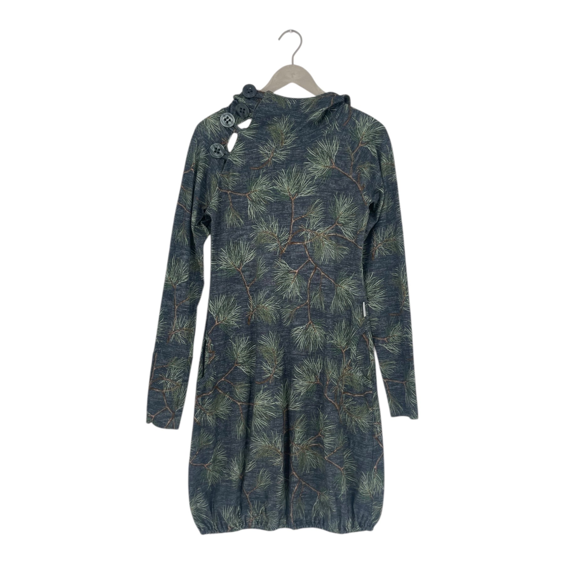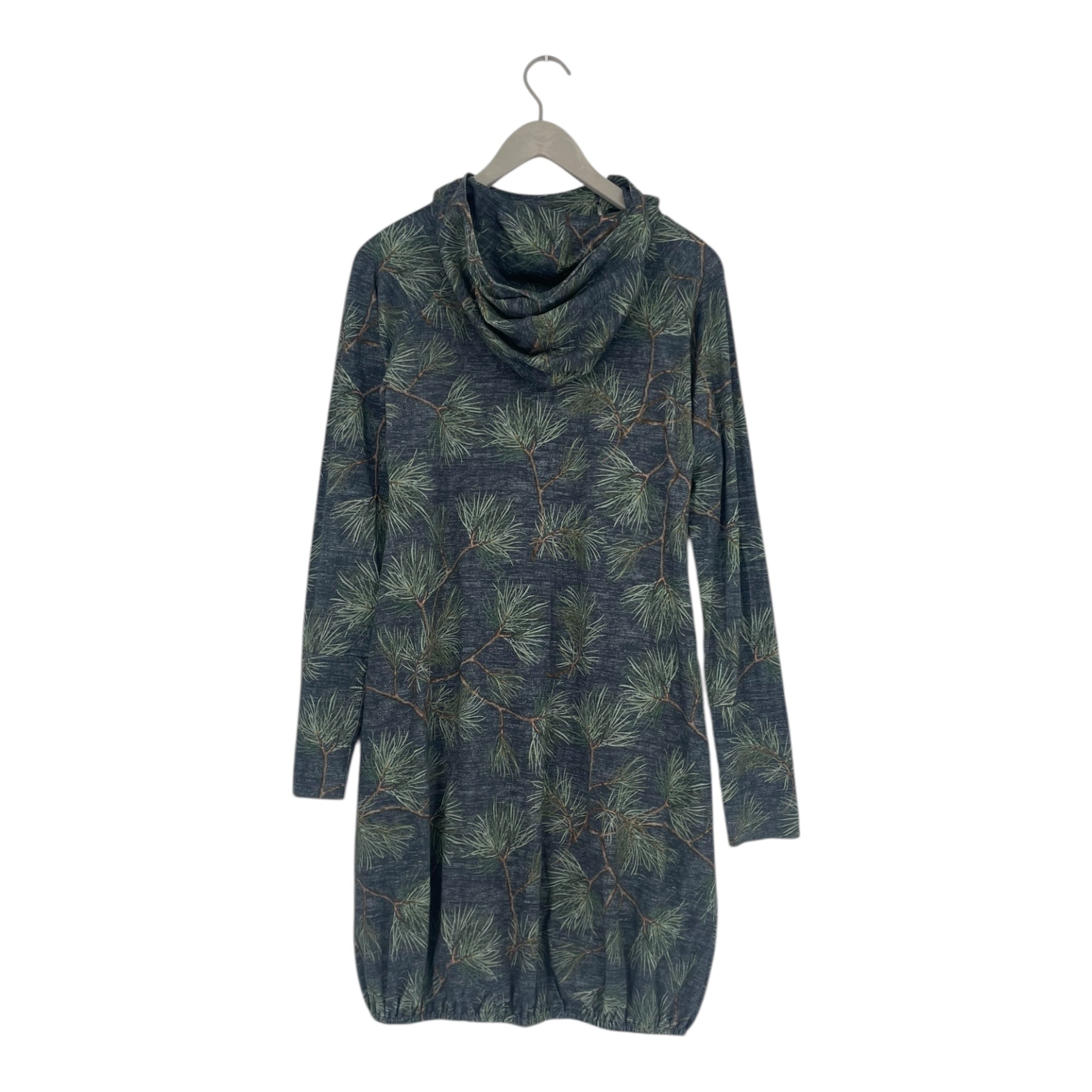 Versonpuoti hooded tunic in Havu print. Pockets on both sides, buttons on the front, and elastic on the hem. The tunic is in good condition, except that the color is slightly faded.