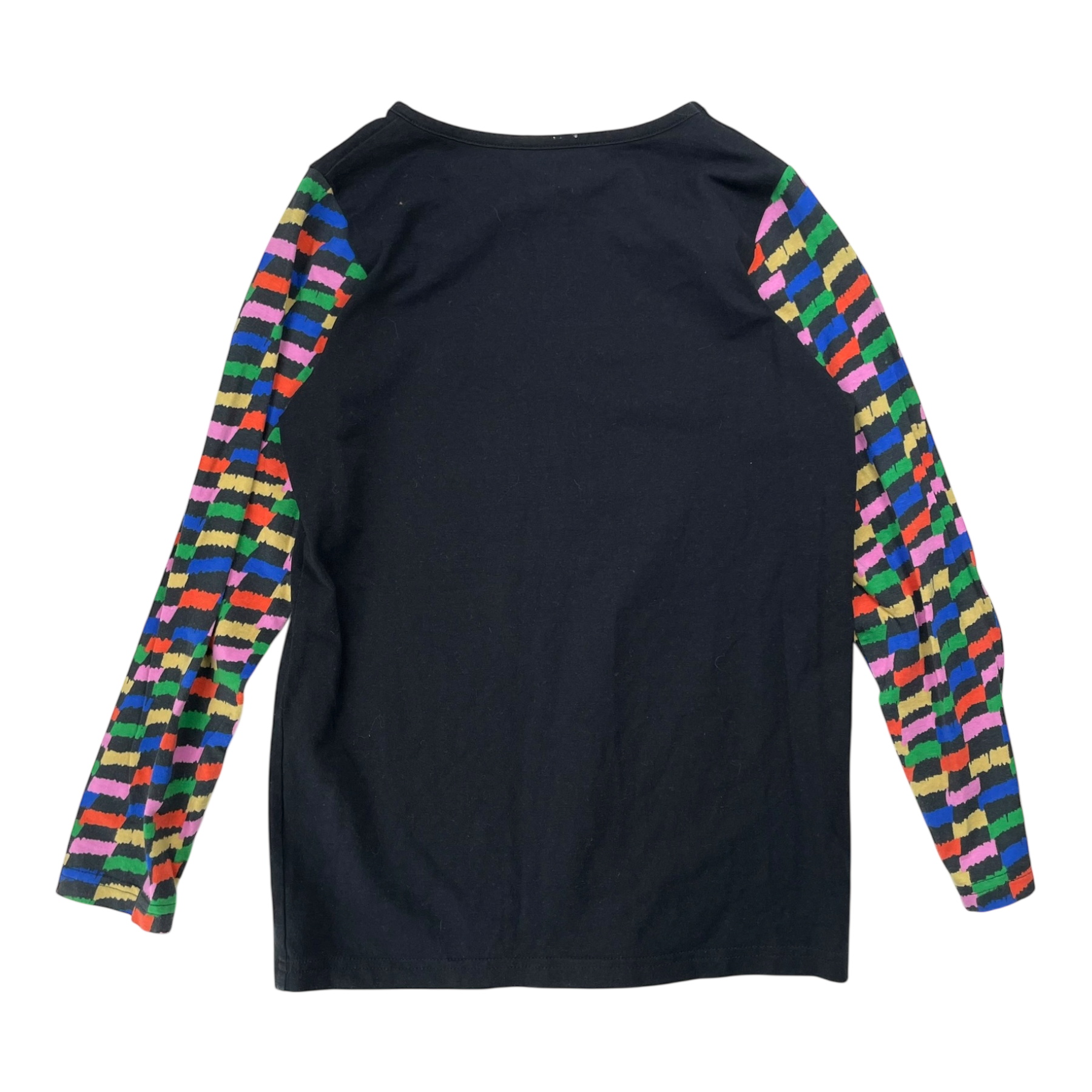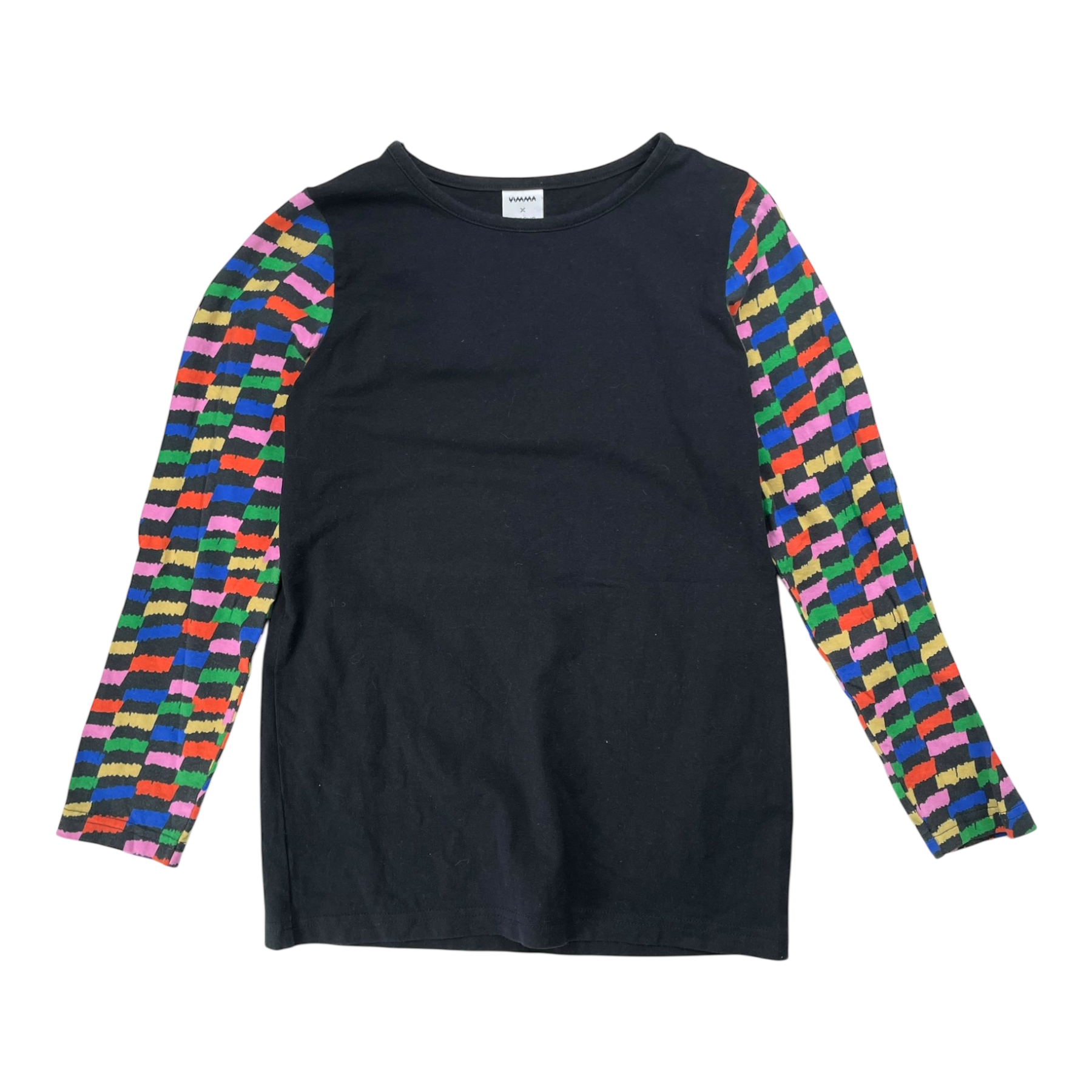 Vimma X Neulomo long sleeve shirt in black with multicolored sleeves.