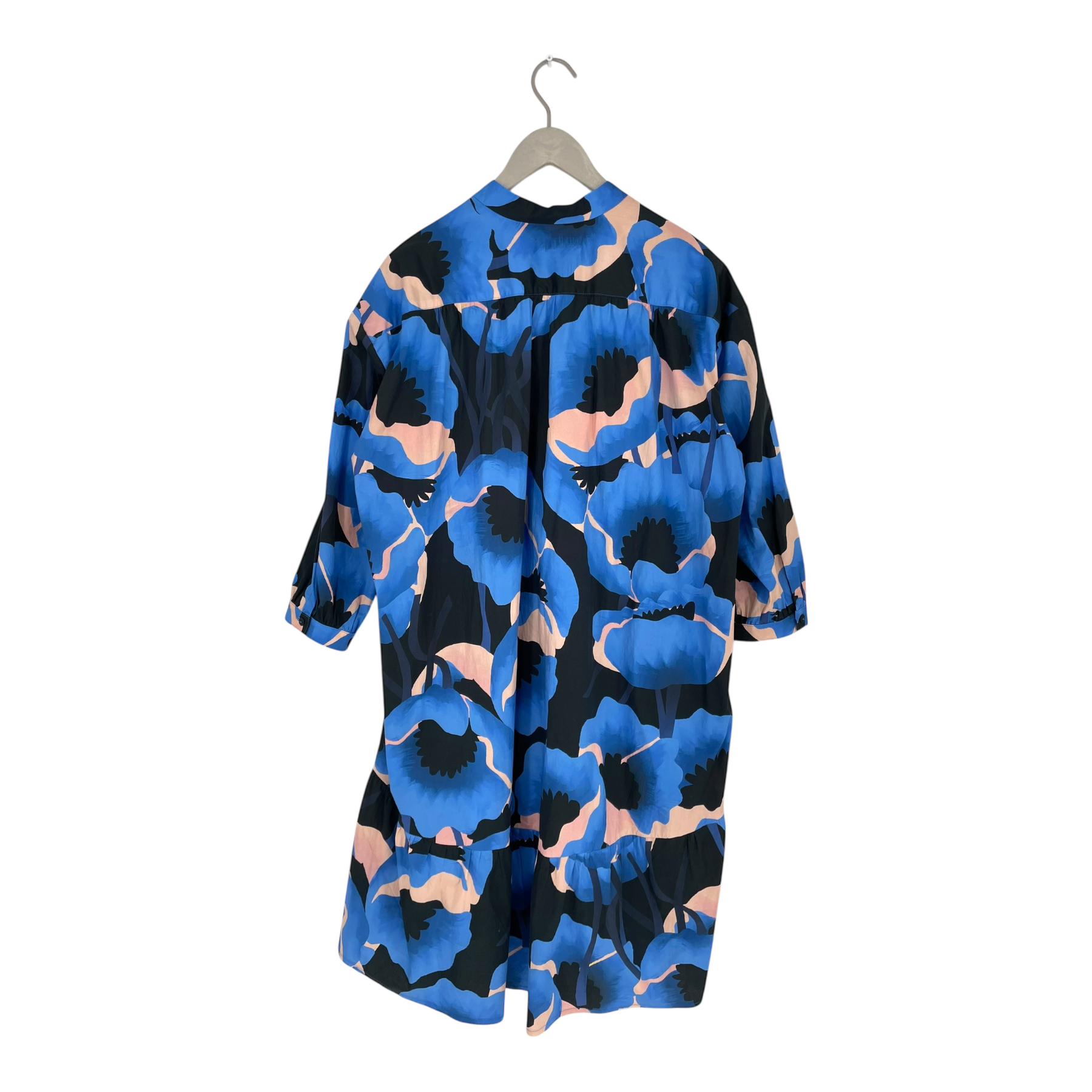 Vimma Tuuva dress with a round neckline, frill hem, large sleeves and pockets on the sides in Kesäyö print.