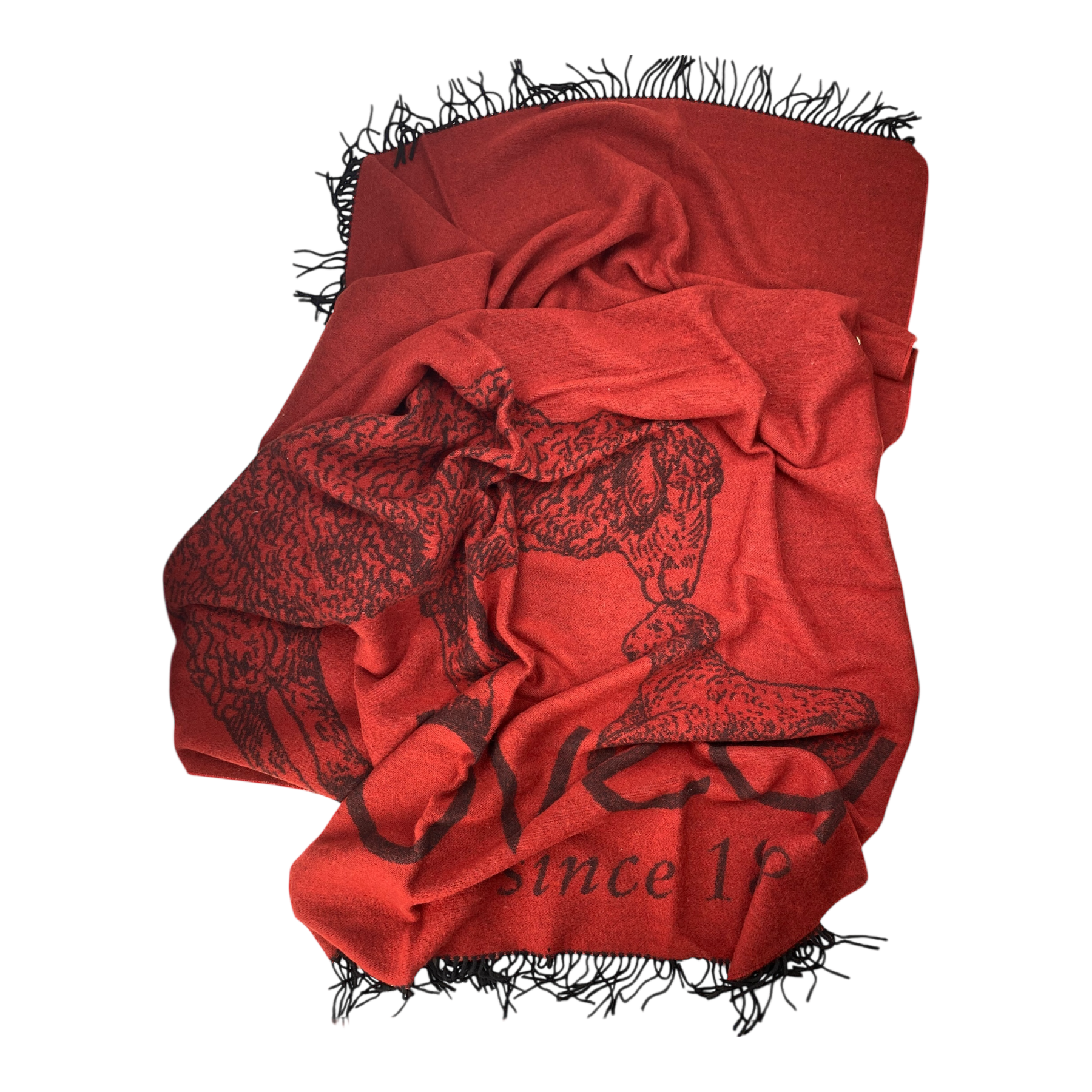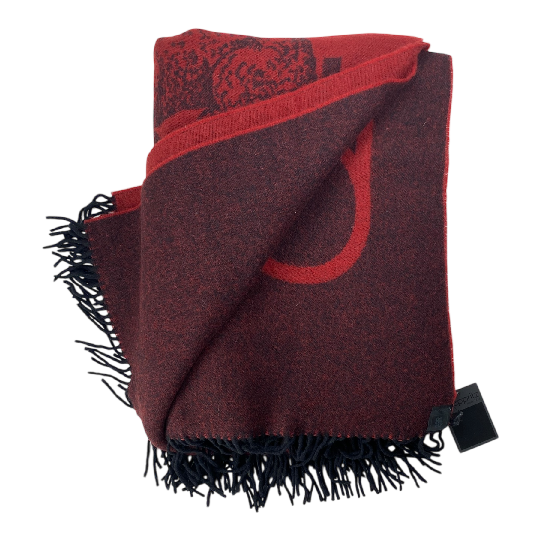 Zoeppritz knitted Bah Beloved! wool blanket with fringes. The blanket features an image of two sheep and the text “beloved since 1828.”