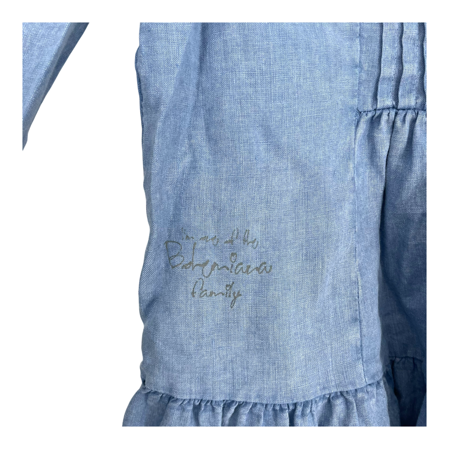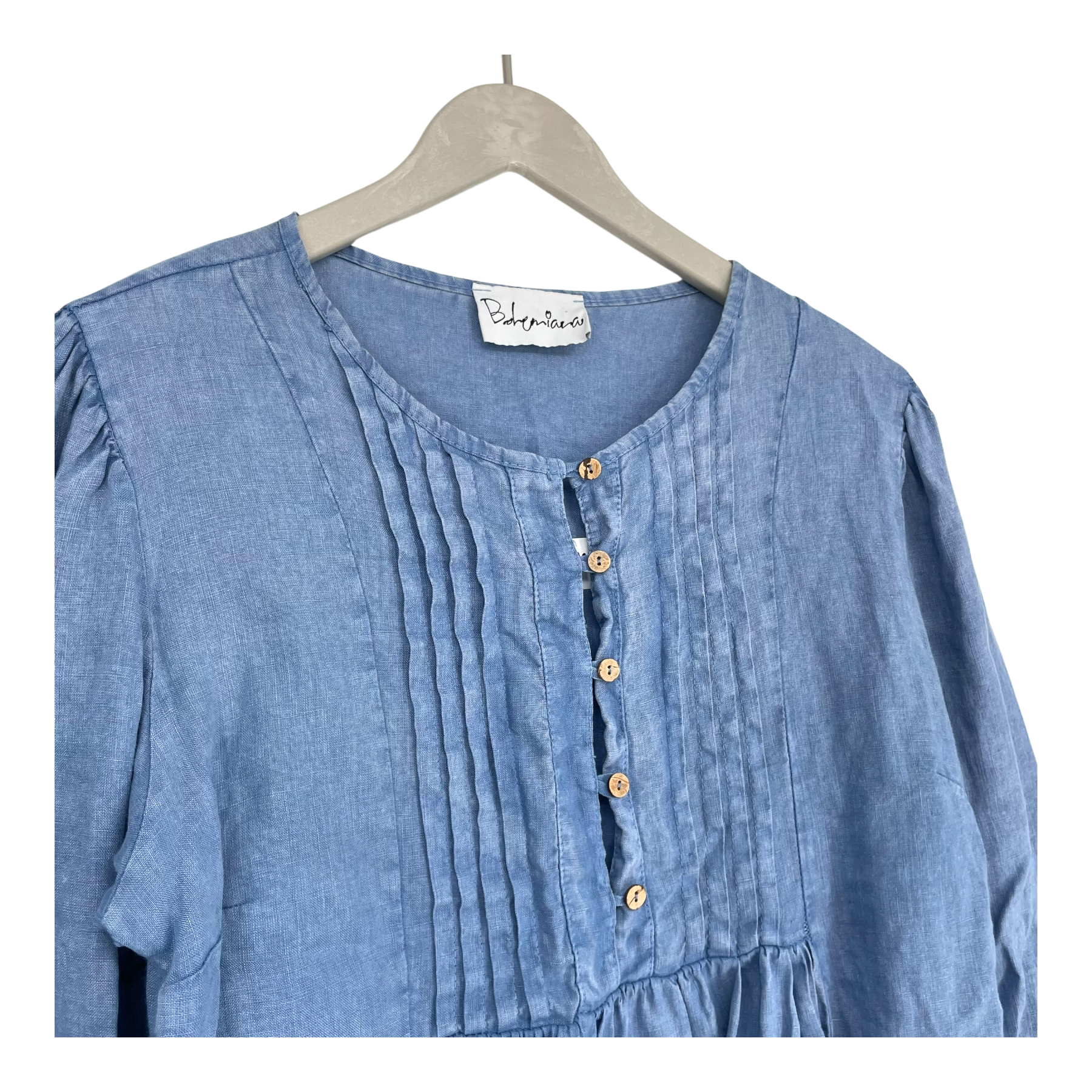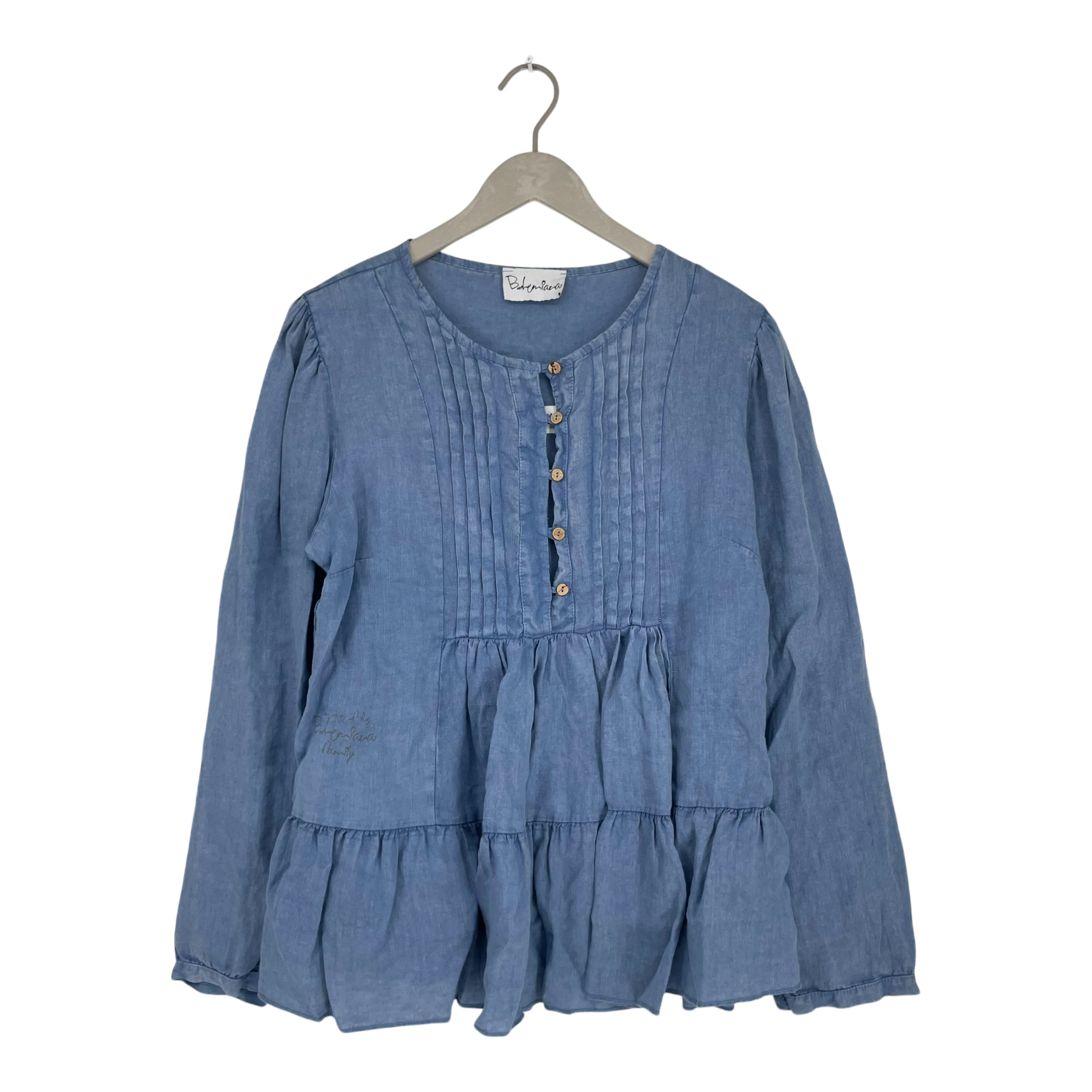 Bypias linen blouse with ruffle hemline and button closure in the front. Some fading on the fabric in the front, but not sure if on purpose.