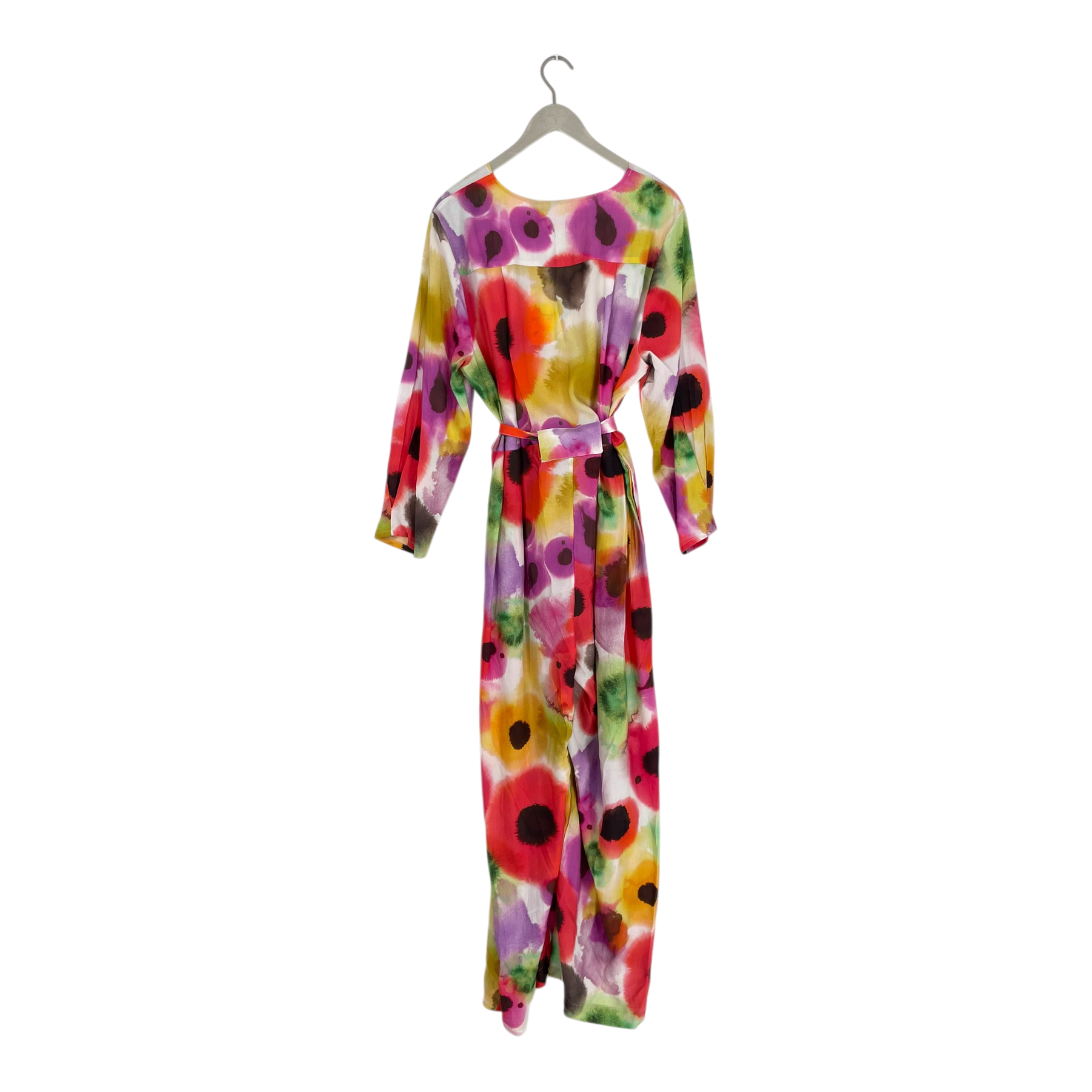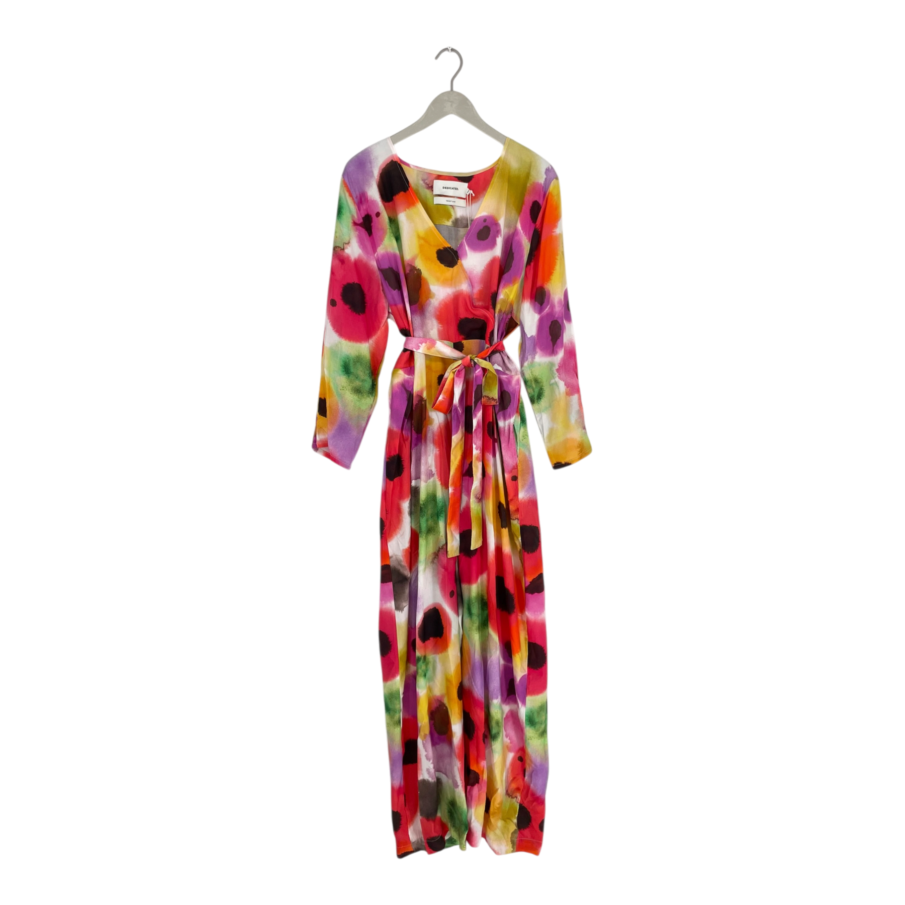 Dedicated x Stina Persson wrap jumpsuit in vibrant multicolor floral print. Features long sleeves, V-neckline, and tie waist belt. Full-length design with relaxed fit.