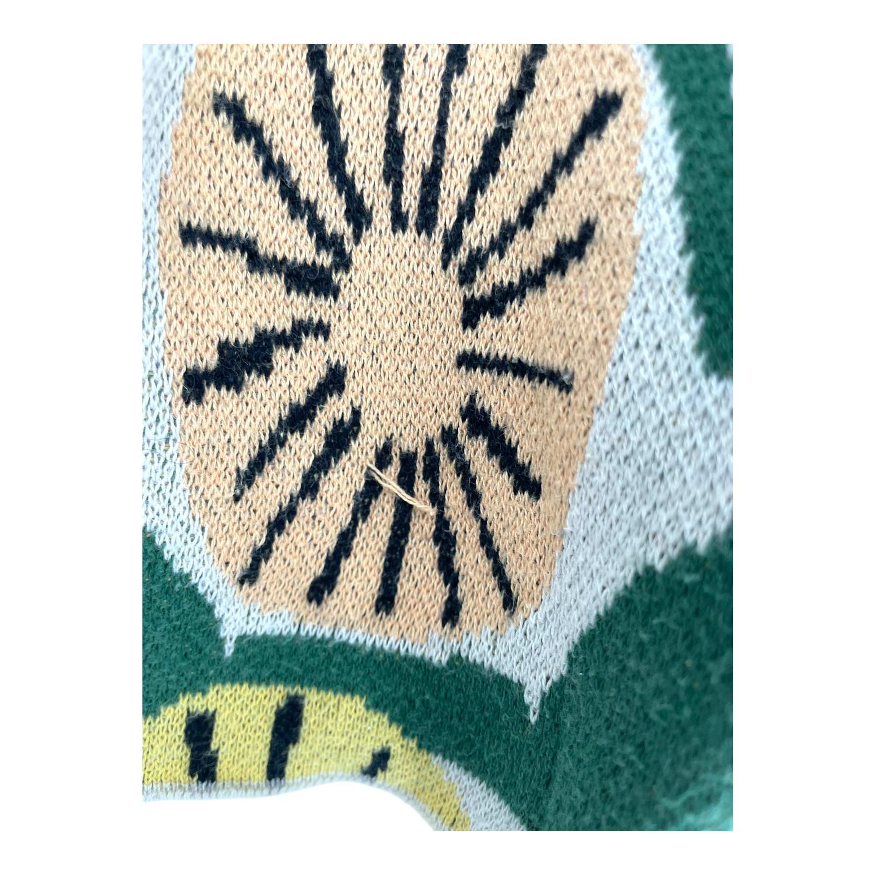 Dedicated cropped knit shirt in a dandelion design. The item has an unfinished rolled hem, round neckline and a slightly oversize fit. There is one loose thread on the item, as shown in the last picture.