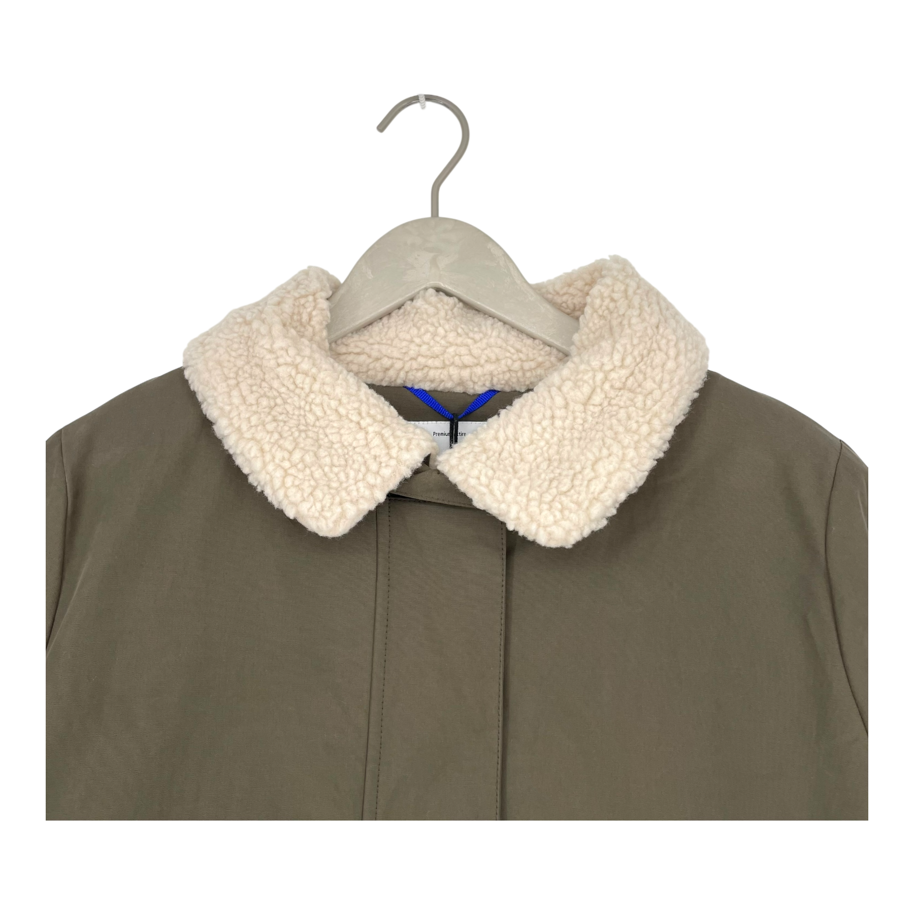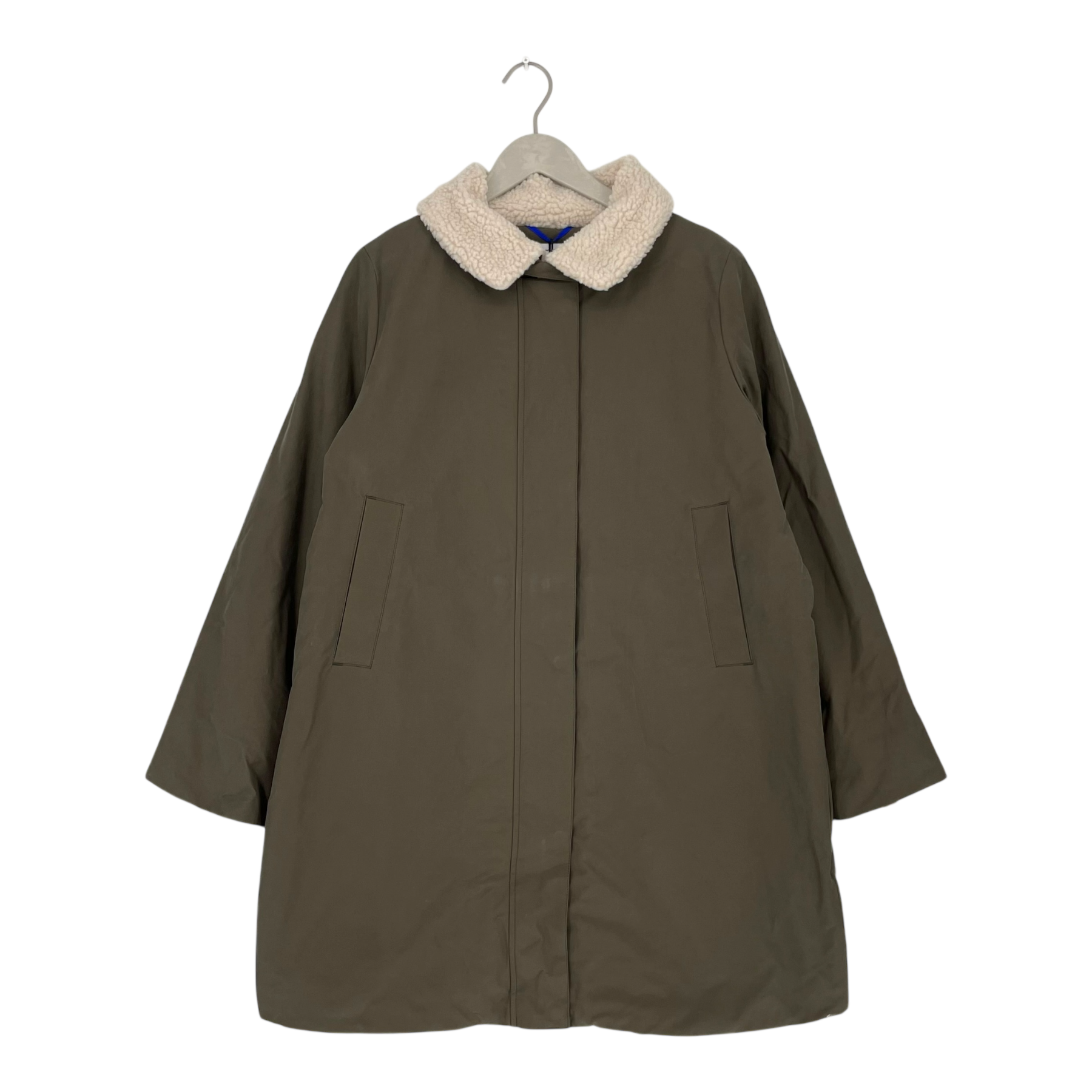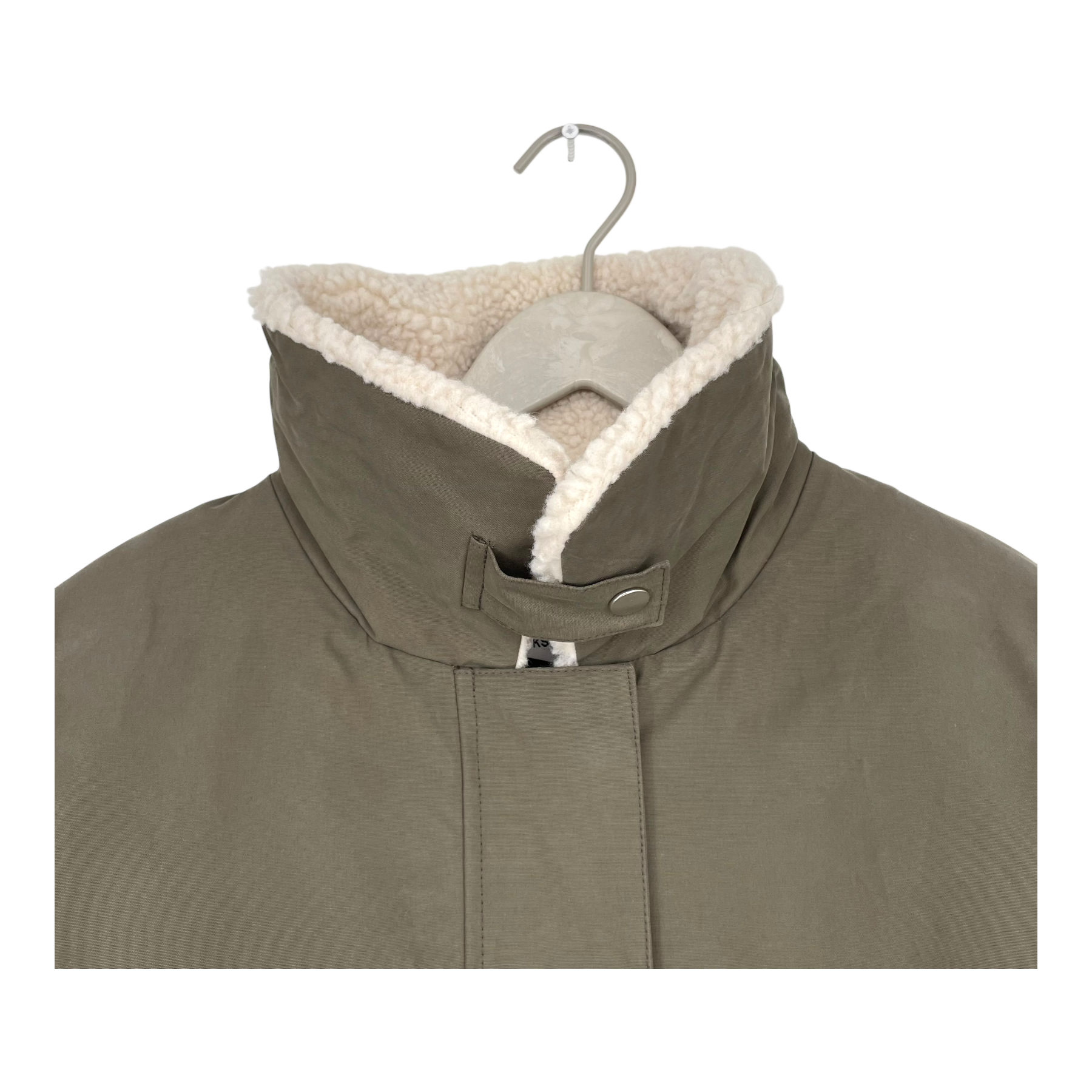 Embassy of Bricks and Logs Jondal parka is made out of a waxed outer fabric that is lined with a 100% recycled and vegan inner and has a no-down filler for warmth. Collar and inner is lined with sherpa fabric to make it warm and comfortable on the skin.