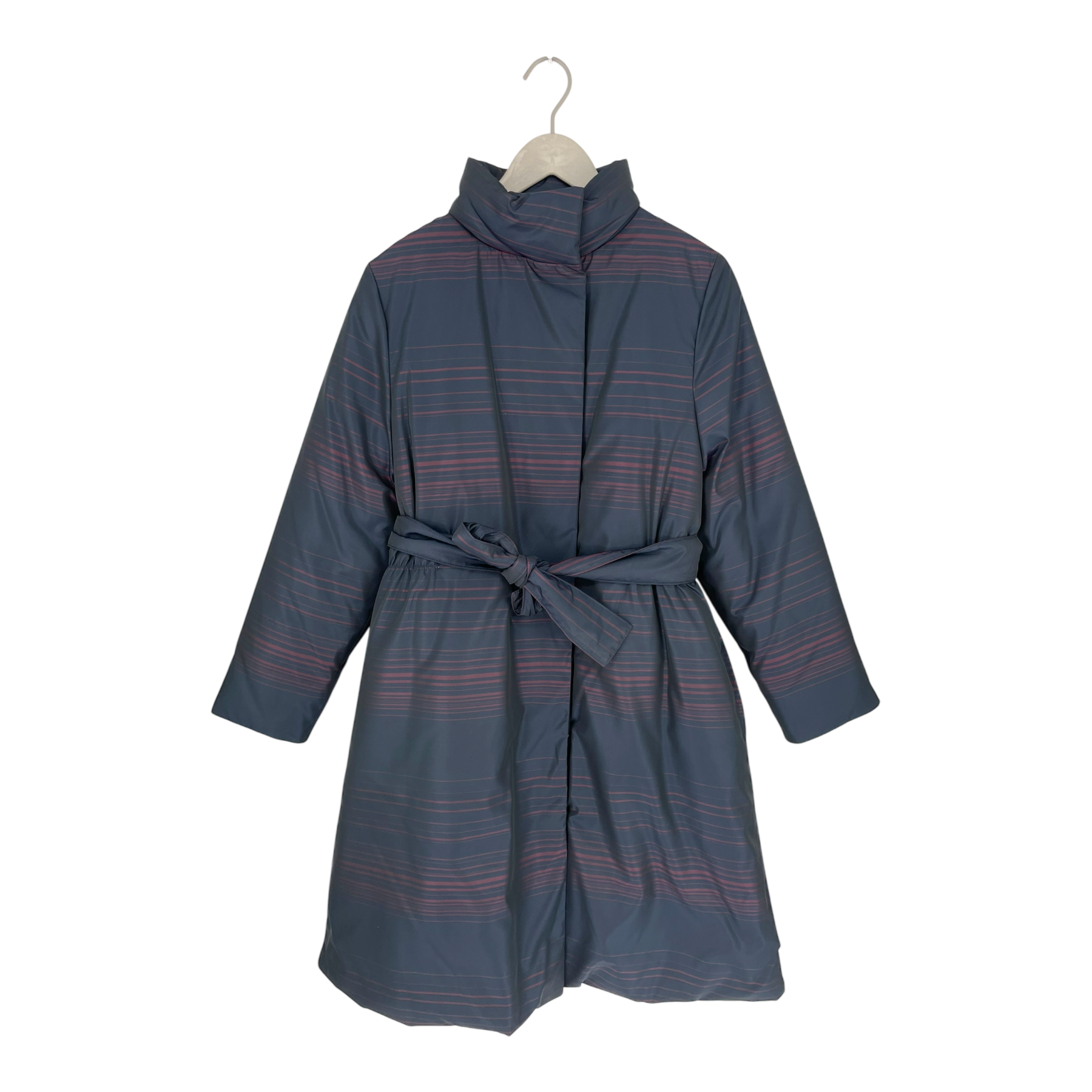 Falla Finland® Viima winter jacket is light but warm. Snap button closure, side pockets and stand up collar. Detachable belt so jacket can be worn with or without belt. Slightly gathered waistline from sides. This is a sample item so laundry tag is missing.