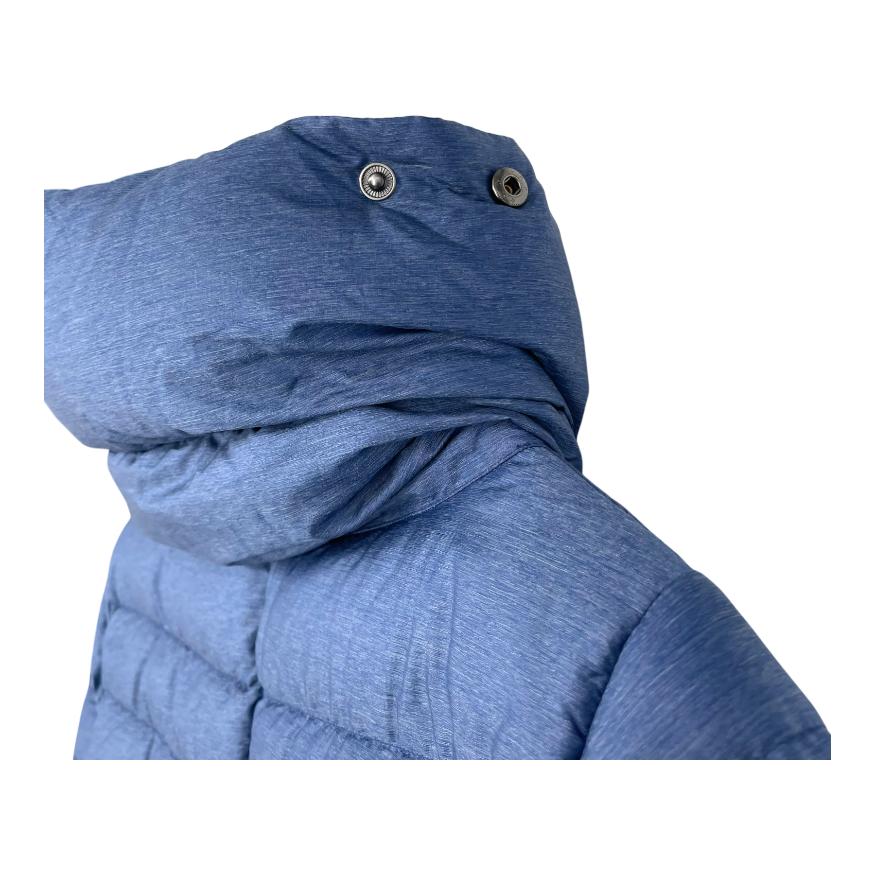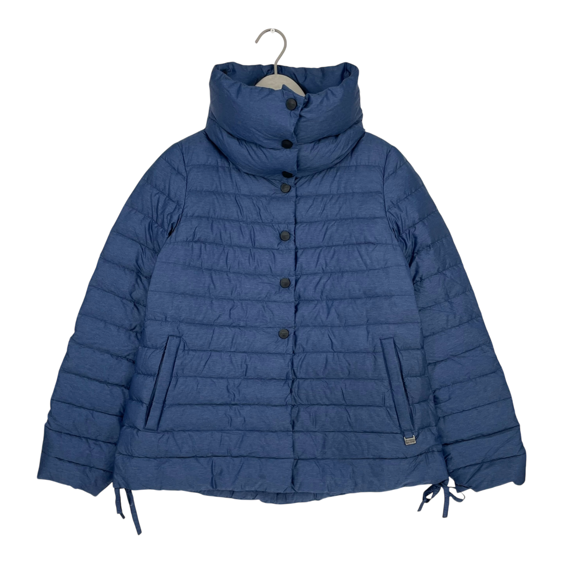 Joutsen Aura jacket is a lightweight down jacket that has a trendy a-line silhouette and horizontal stitching. There is buttons in the front for closure and two vertical side pockets with zippers. The collar can be worn down with buttons or up to protect the neck. There is adjustable drawstrings on the waistline and on the hemline for a better fit.