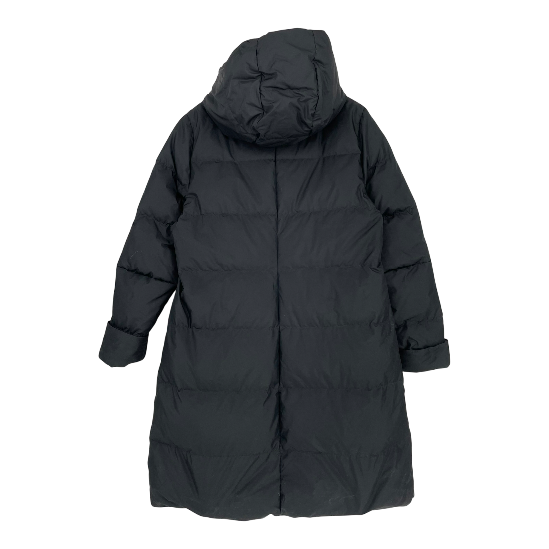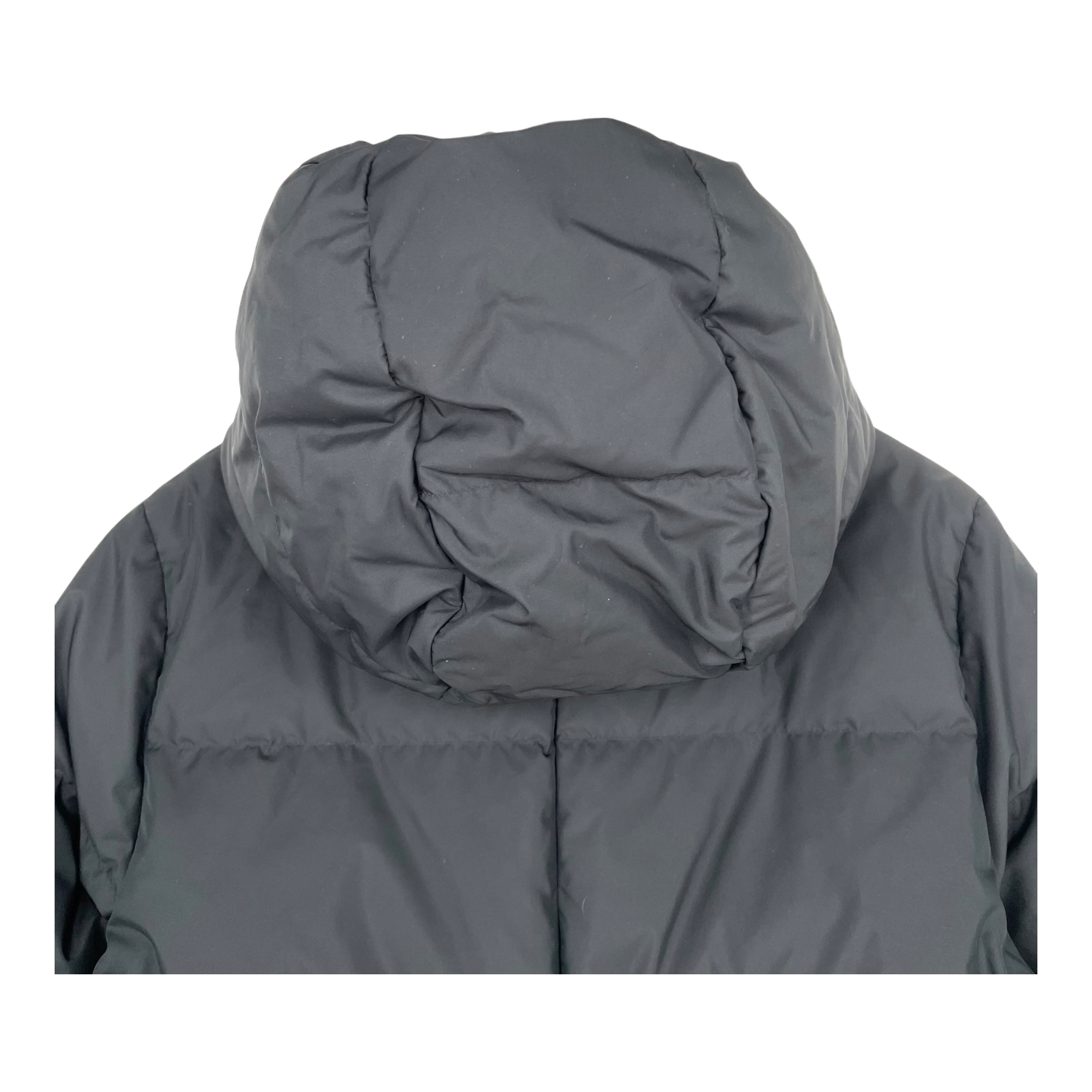 Joutsen Tuuli jacket is a down jacket perfect for the colder weathers. There a large horizontal stitching and two front pockets with zippers. The snap buttons and the double-slider fastening zipper adds comfortability and daily functionality in the front. There is a large warm hood that can be worn up or down according to weather and an adjustable elastic. The sleeves can be rolled up for a better fit.