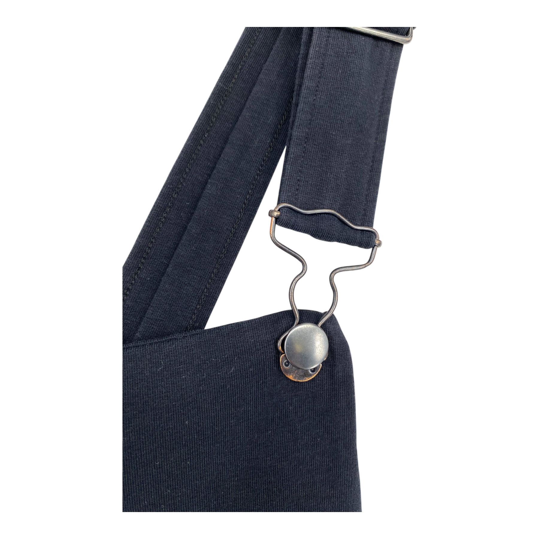 Kaiko women's black overalls. The buttons and fasteners are slightly worn.