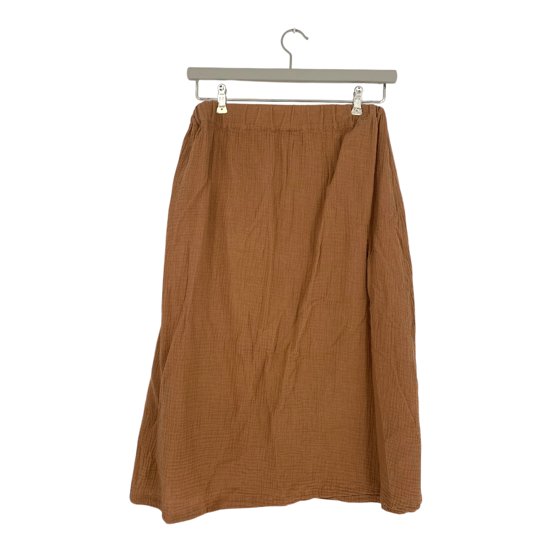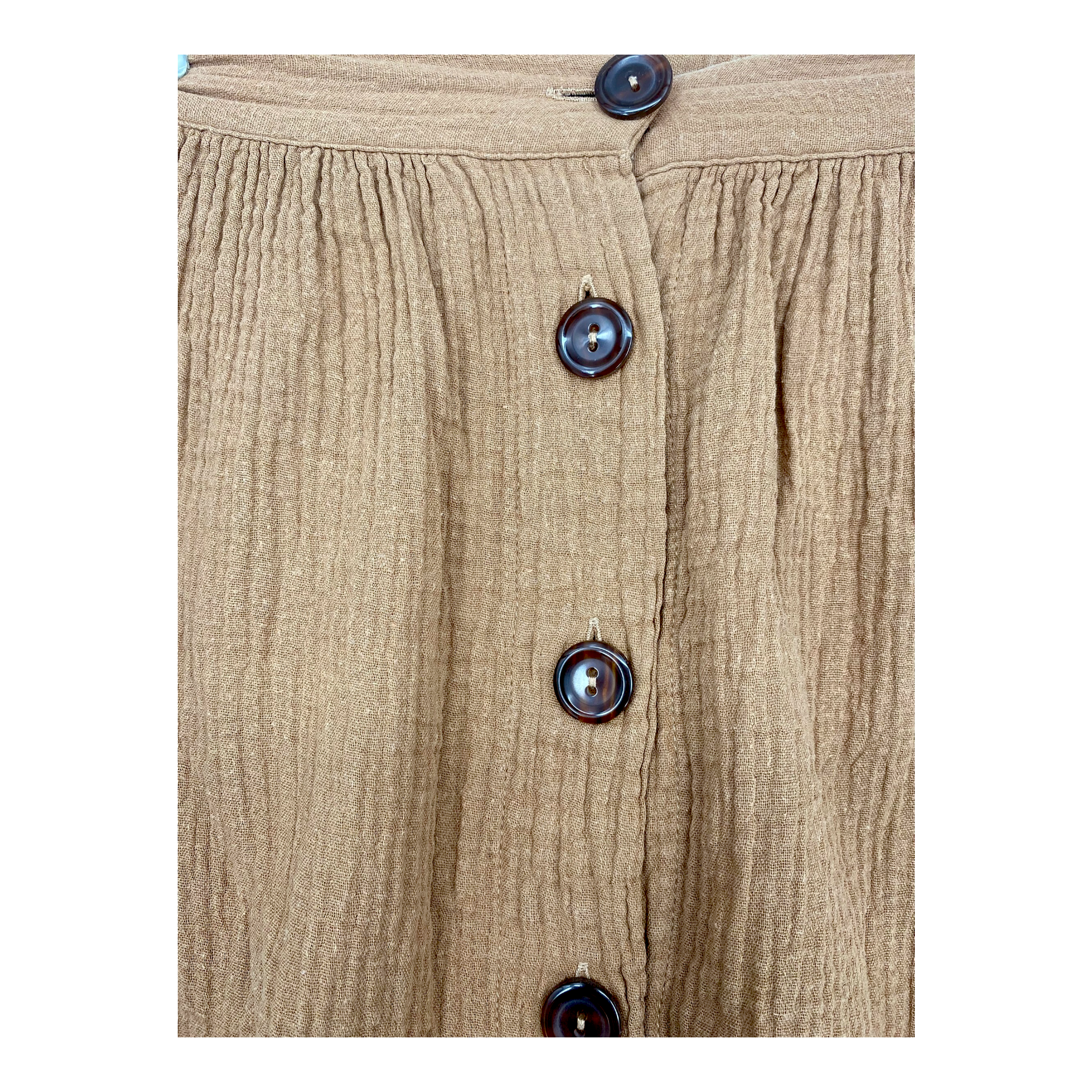 Kaiko midi-length skirt made of woven organic cotton double gauze is embellished with a row of buttons. The elastic waistband at the back ensures ease of dressing and comfort.  Double gauze does not require ironing and you can wear it straight from the clothesline. Unlined. The size tag is missing but the size most likely corresponds to size M. The item is quite stiff from the wash and the fabric shows signs of fading.