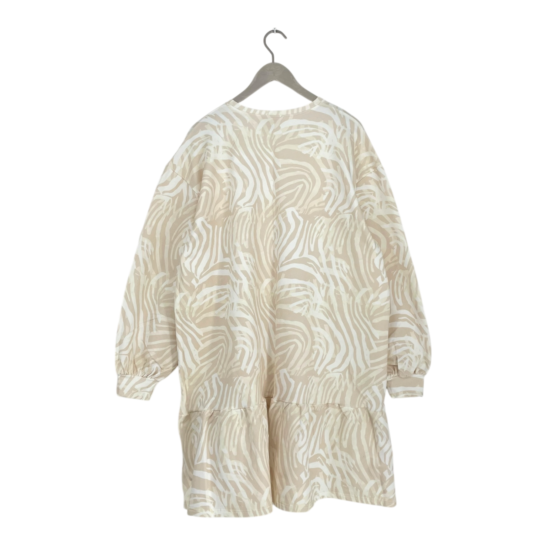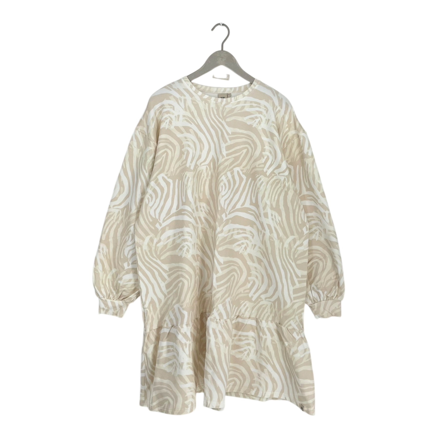 Kaiko Ruffle sweatshirt dress in zebra print. The jersey dress has oversize fit, a dropped shoulder, long sleeves, and playful frill in the hem.