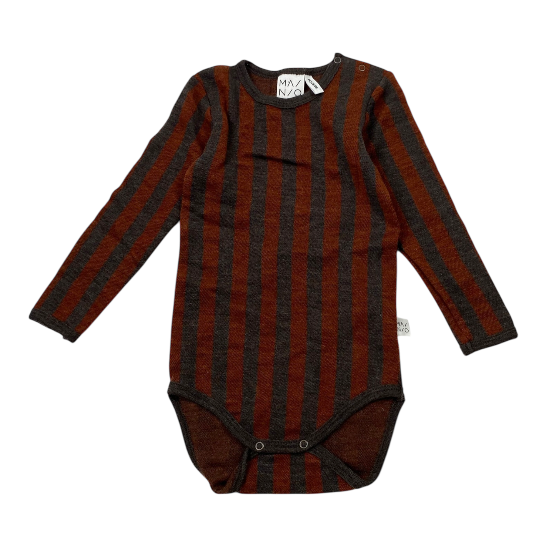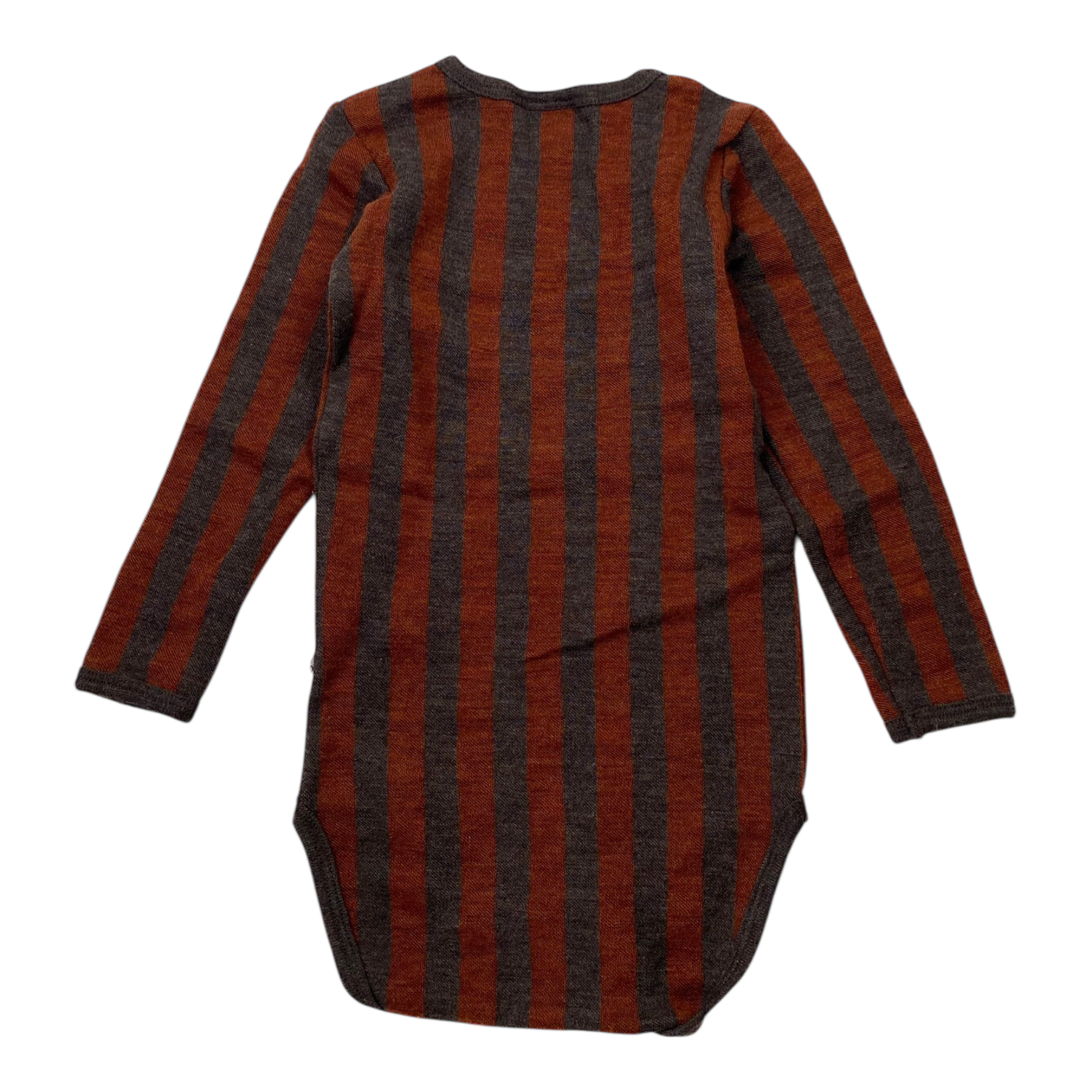 Mainio merino wool body with snap button closure in stripes print. The size corresponds to the larger size.