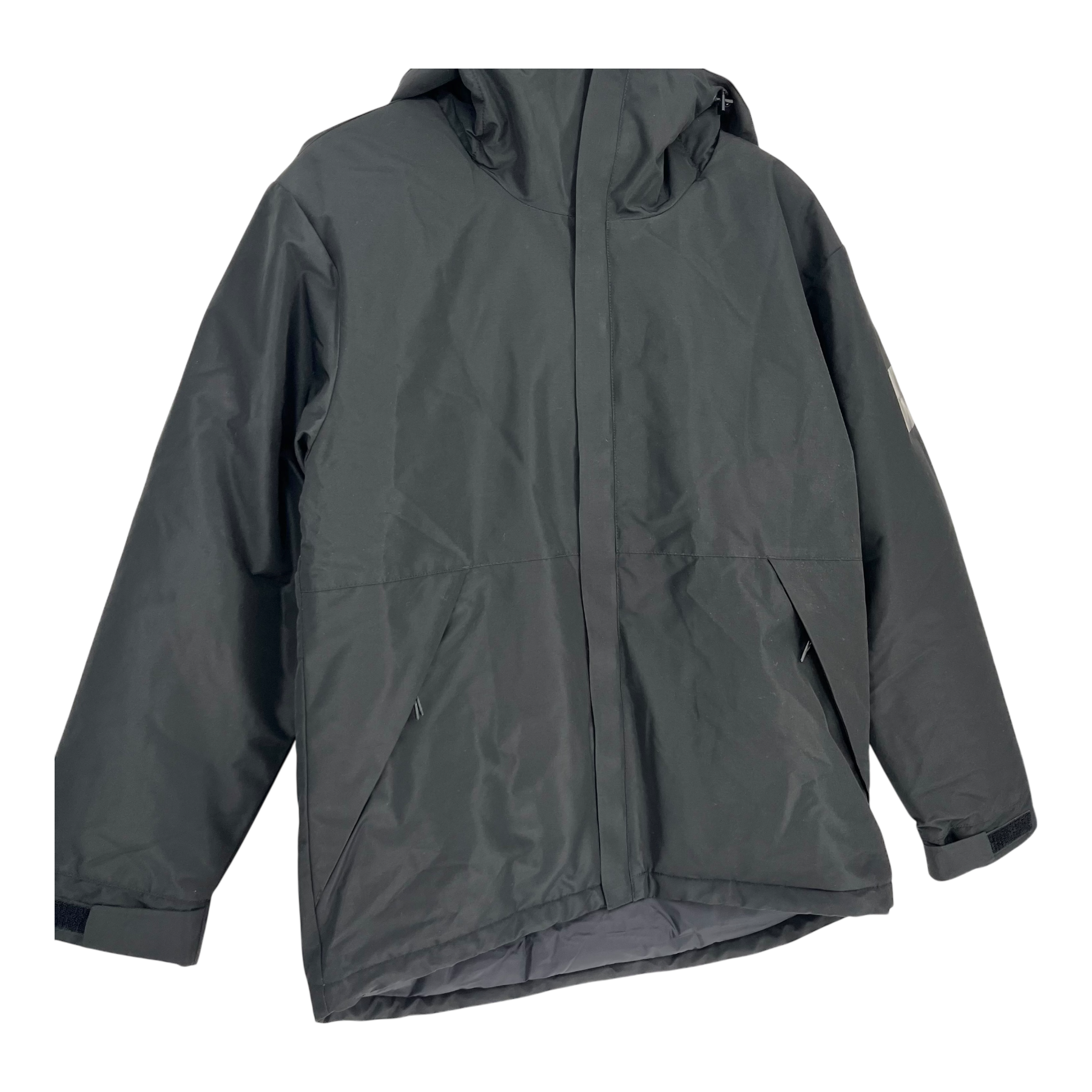 Makia men's Principal jacket designed in harsh Nordic conditions with functionality and toughness in mind. The jacket has a regular fit, elasticated hood adjustment with laminated hem and fastening with two-way zip and snaps. There is front fleece pockets with zipper and inner chest pocket with fleece.