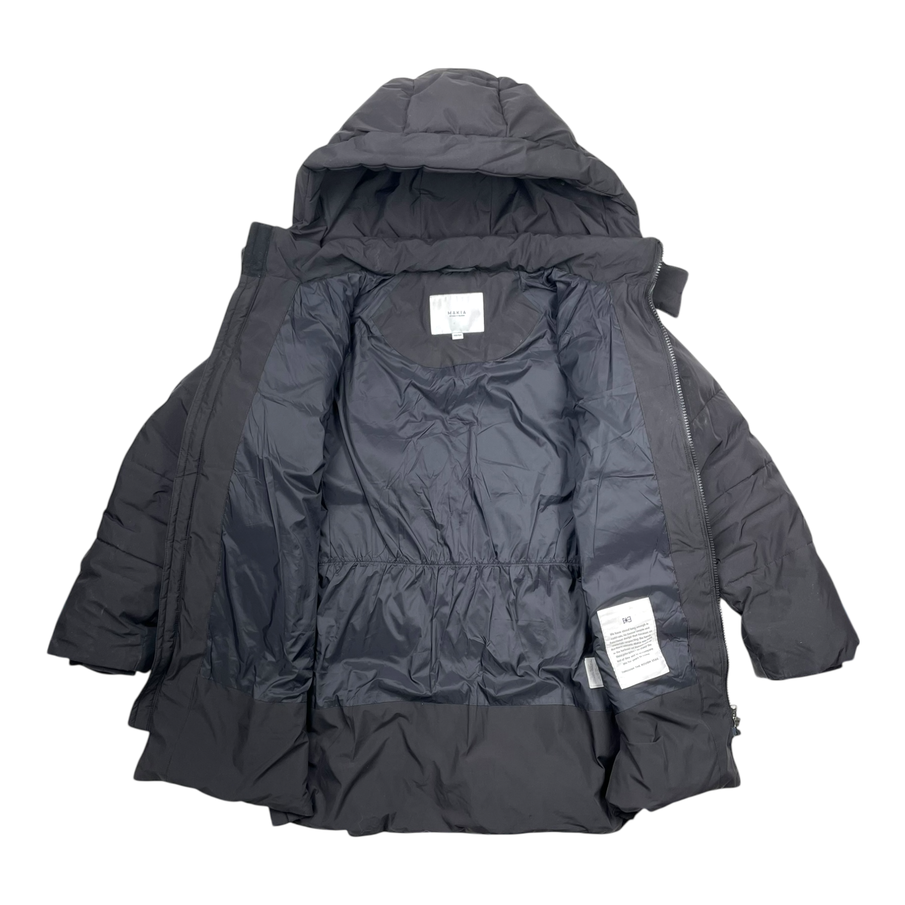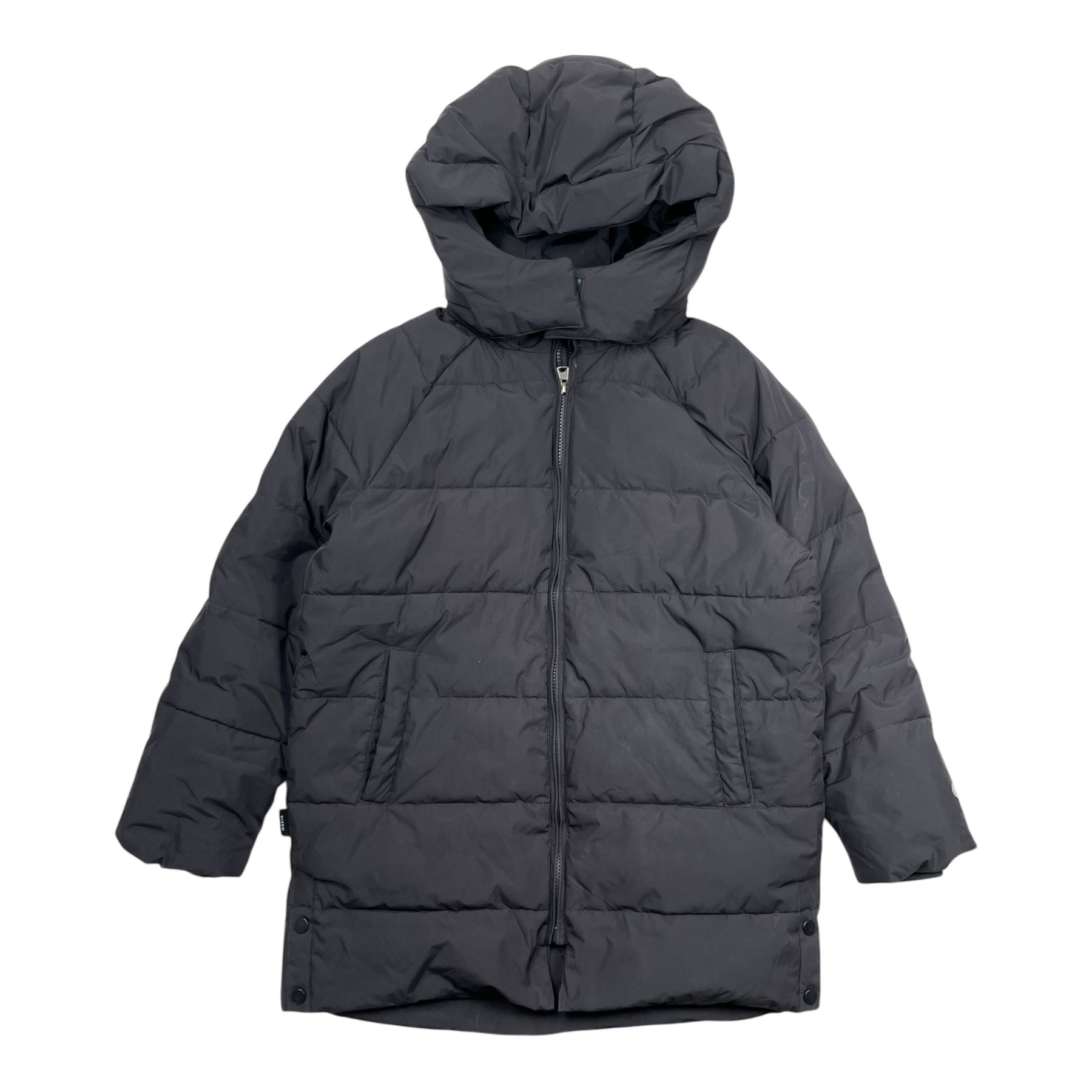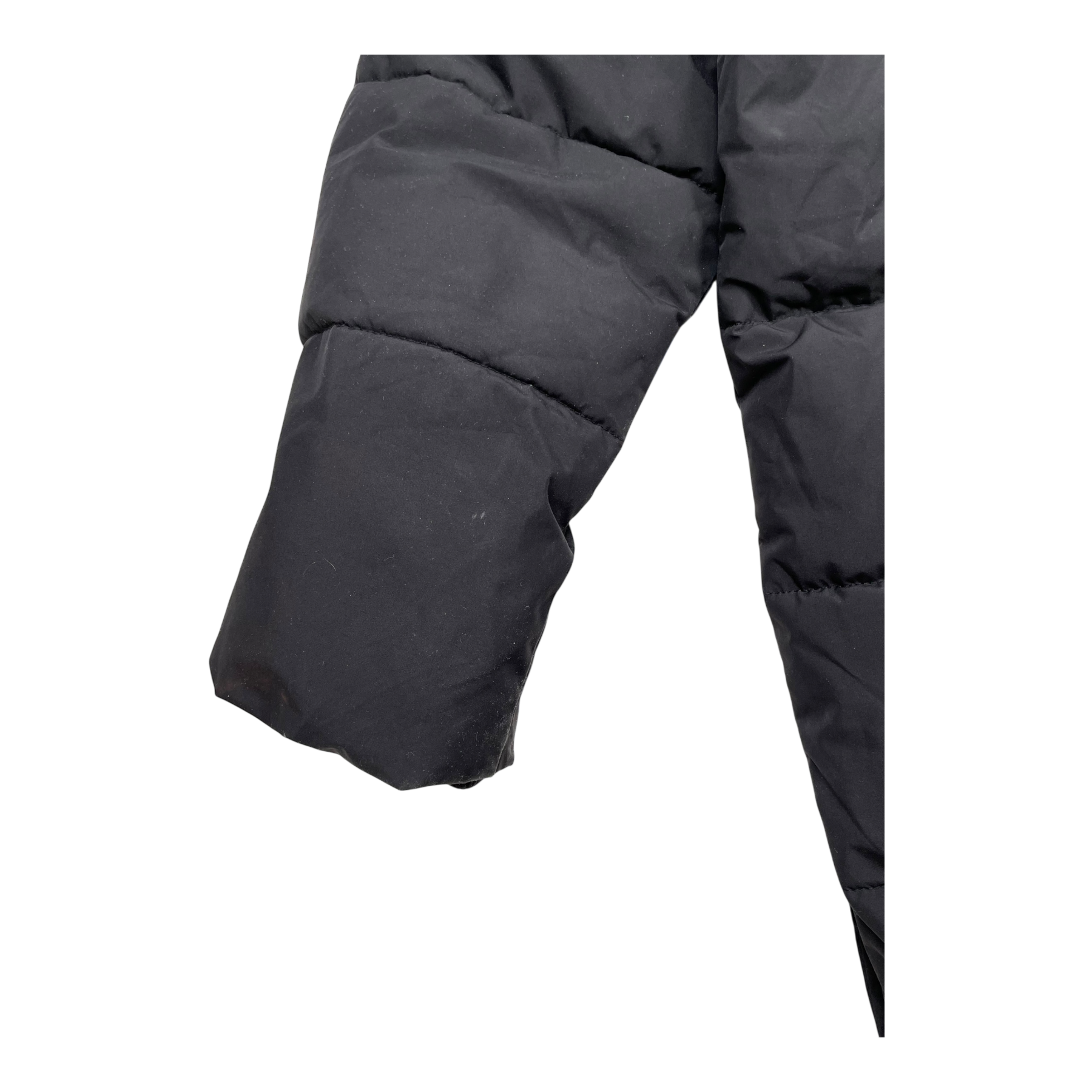 Makia kid's winter puffer jacket with a removable hood and zipper pockets. The jacket has some light stains.