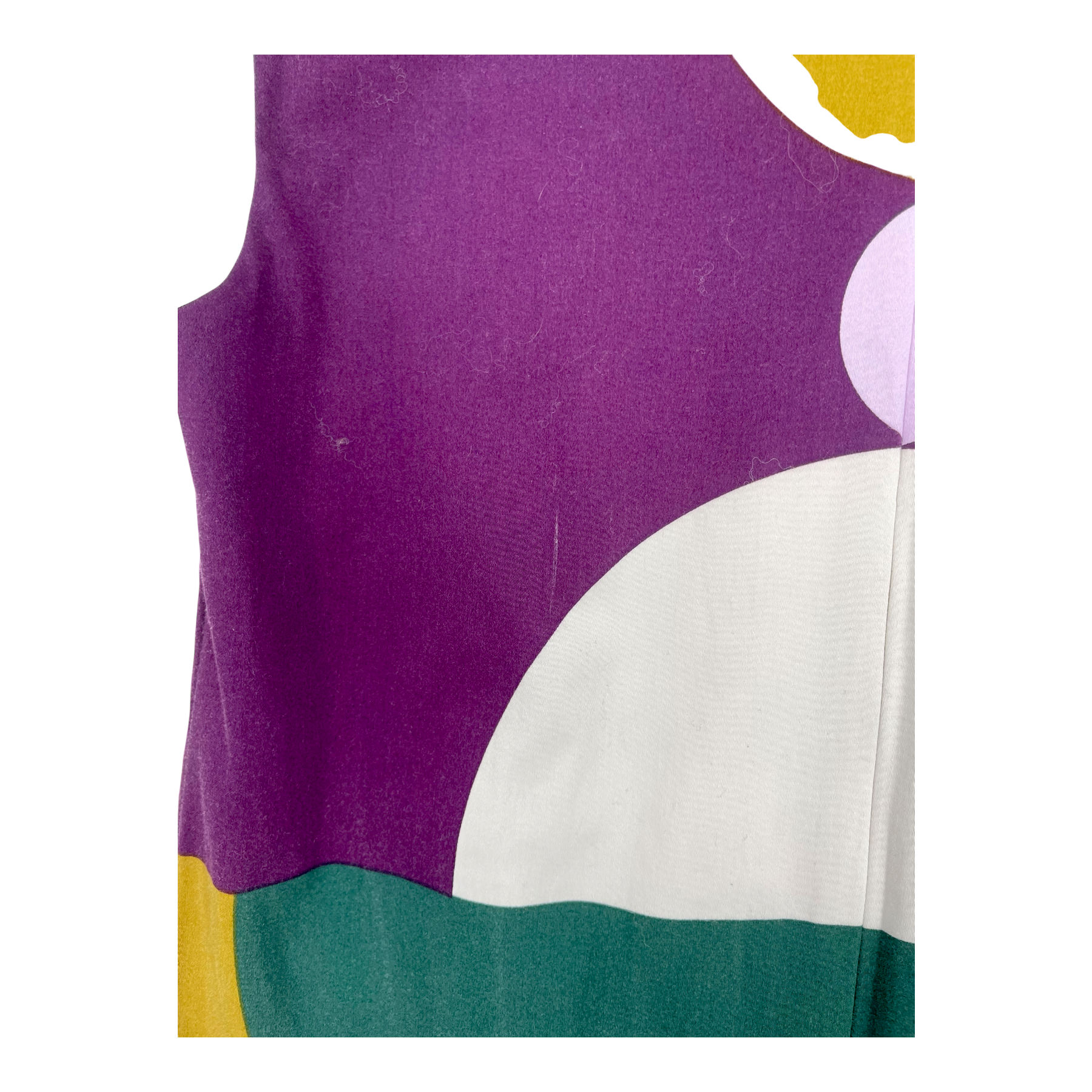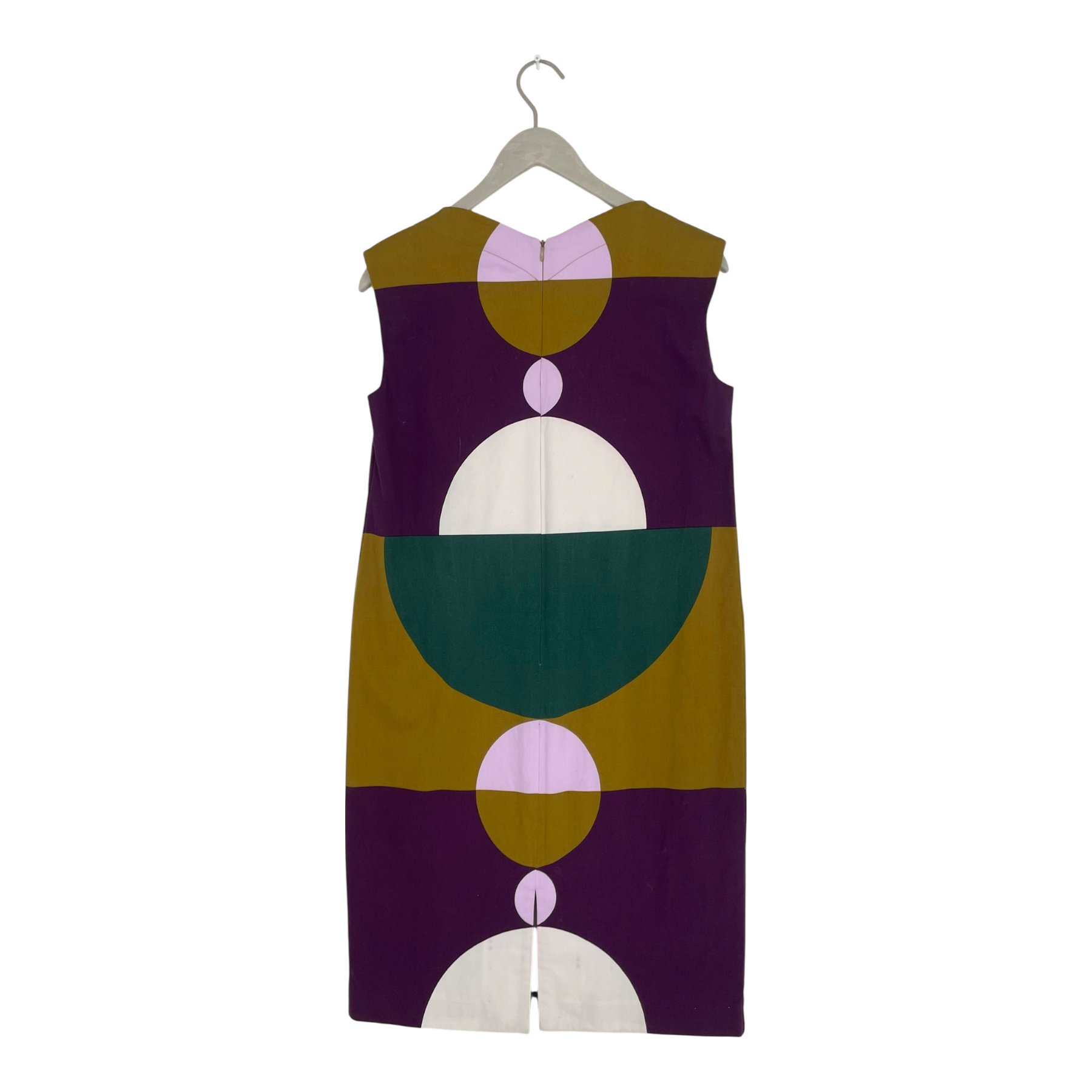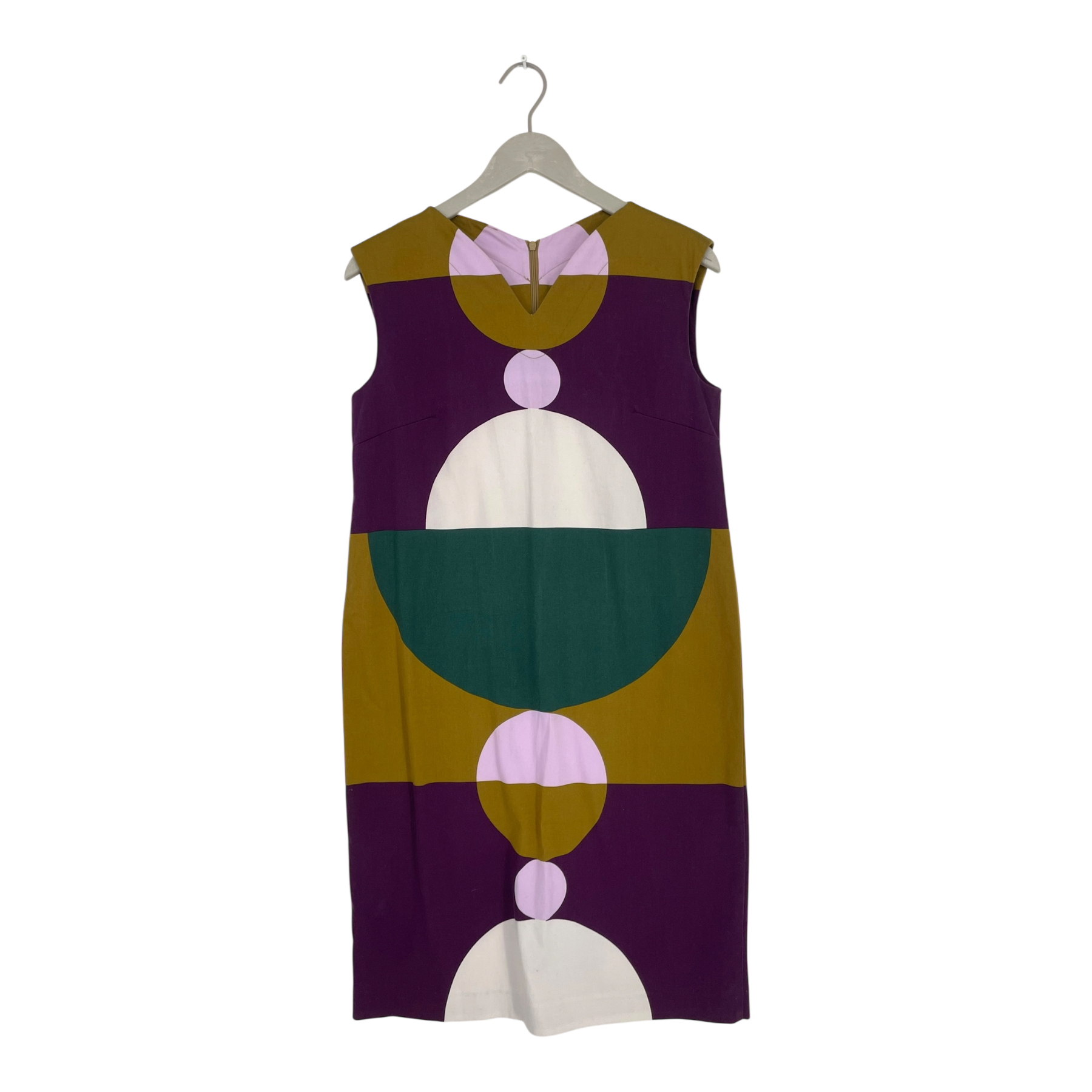 Marimekko Arpa sleeveless woven dress with an adjustable and removable fabric belt. The Arpa dress has darts on the bust, a v-neck and hidden zipper closure on the back. The item has a few stains as shown in the pictures.