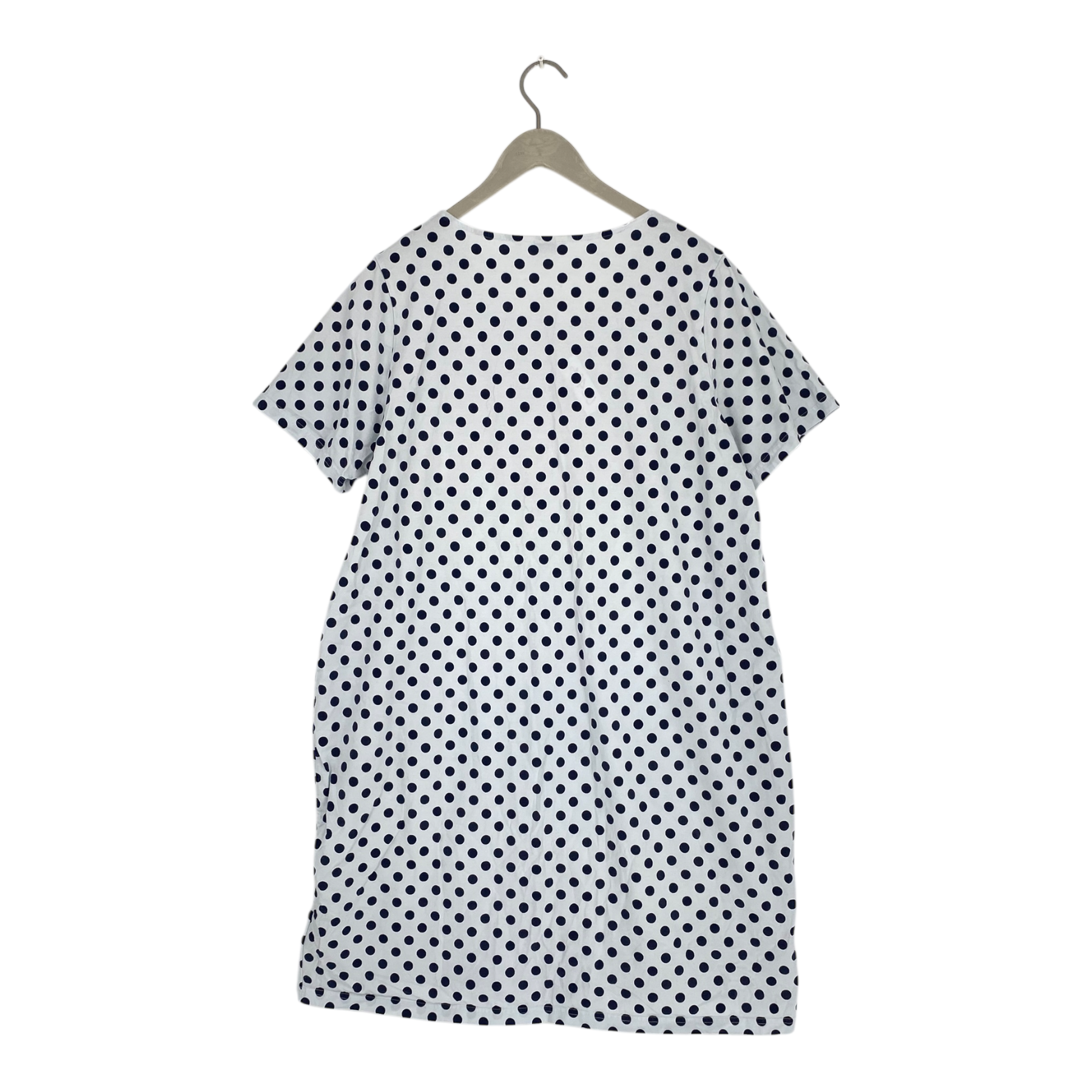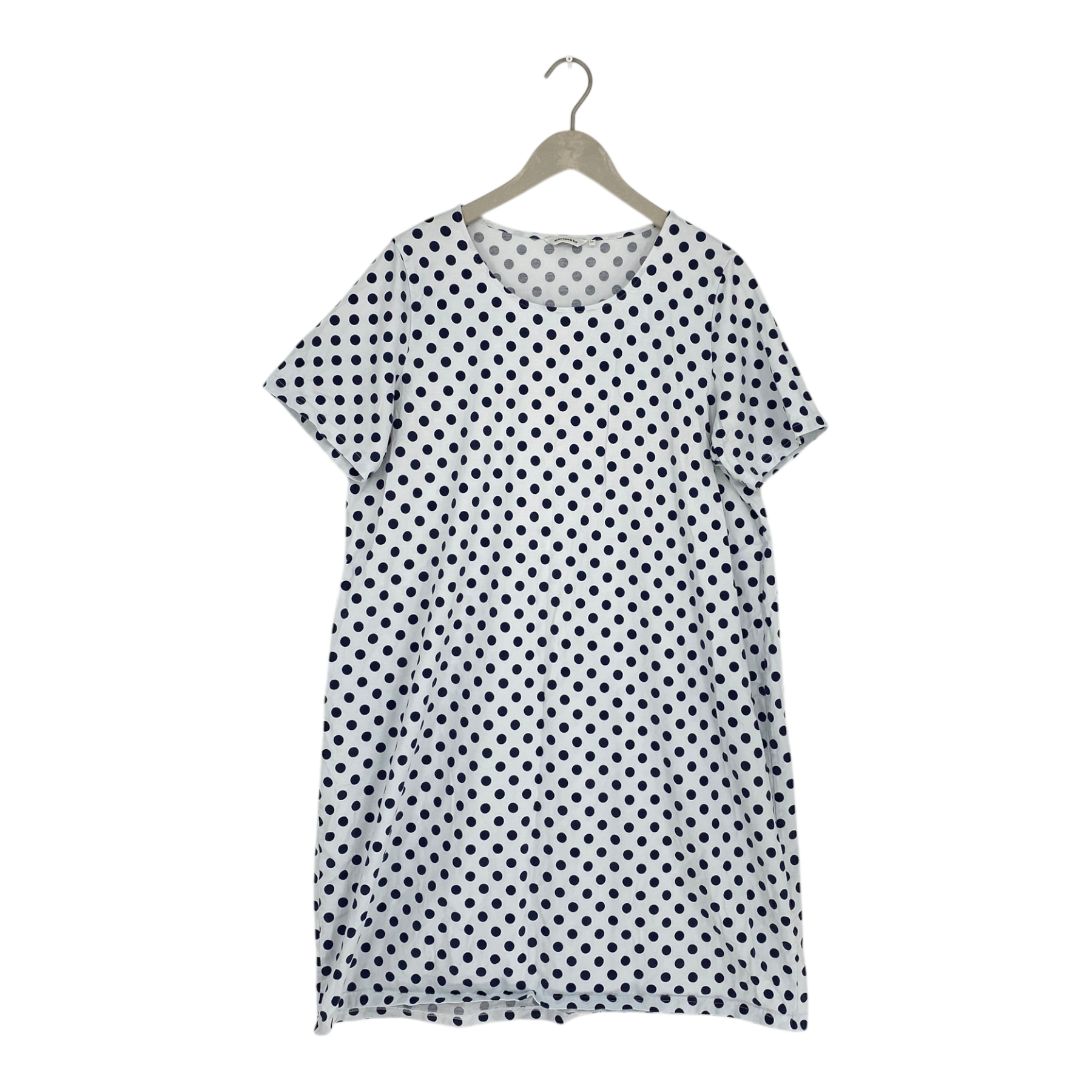 Marimekko keskiyö dress with Pallo print short sleeves. The dress’s colors have blended slightly, so the white base color is not completely bright.