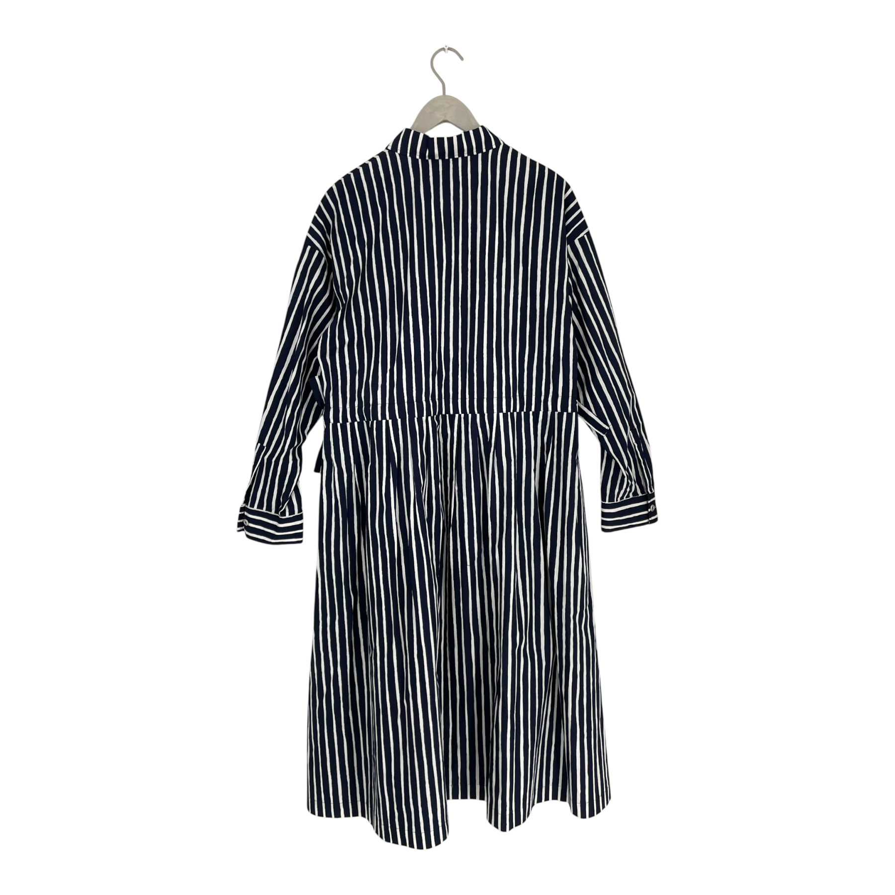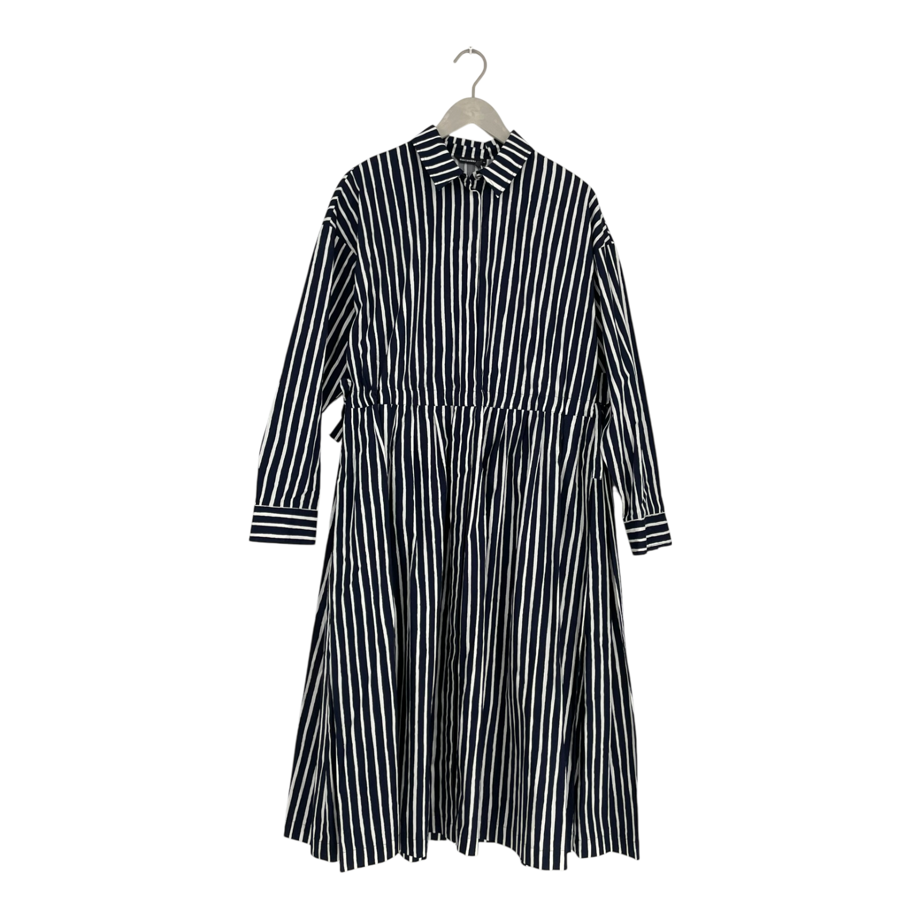 Marimekko Reetta dress features the dark blue and off-white Piccolo pattern on crisp cotton poplin. Designed with a relaxed fit, the shirt dress includes practical drawstrings at the waist for an adjustable silhouette. It has a full-length concealed button placket stitched closed at the waist, and the A-line hem falls below the knee for an elegant finish.