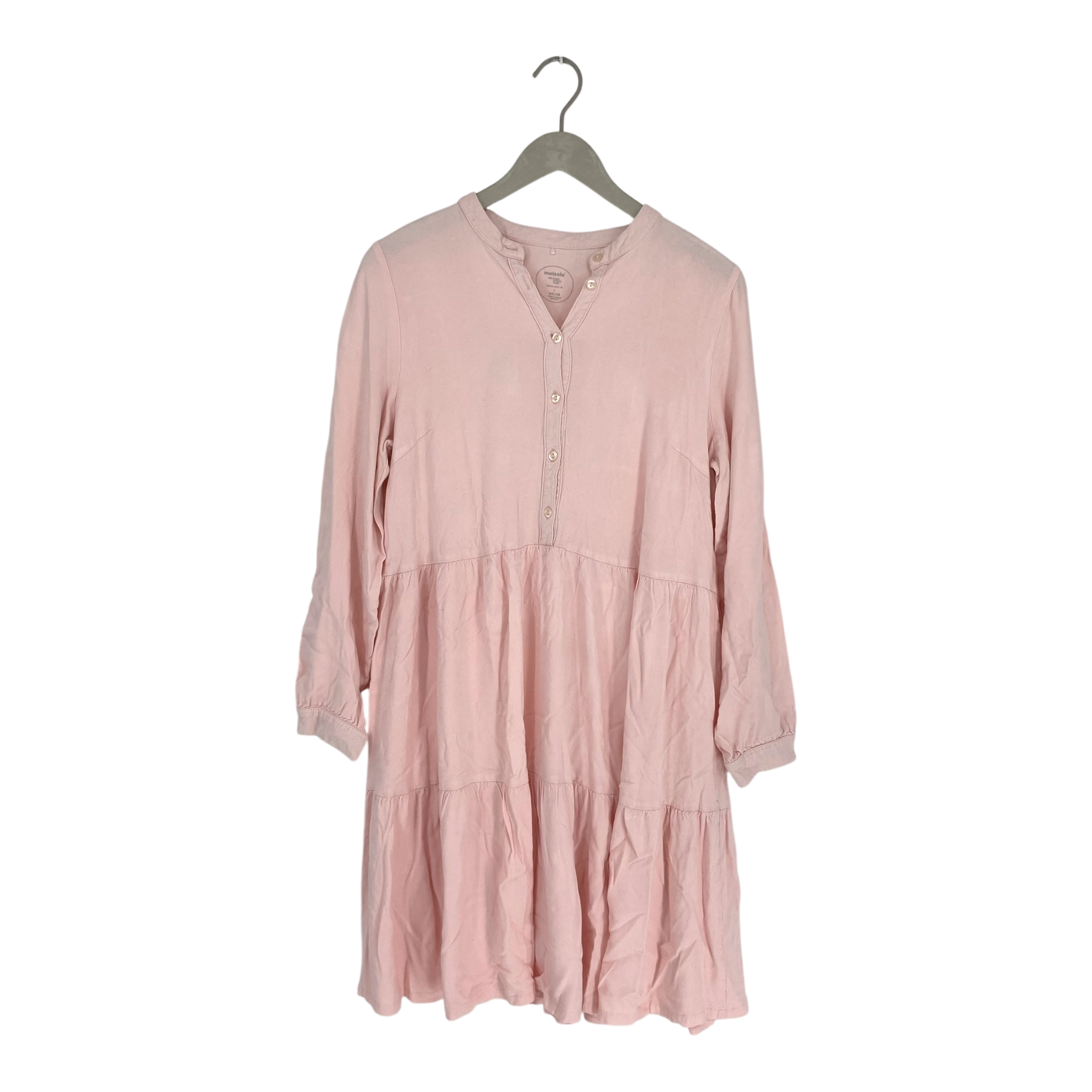 Metsola dress with long sleeves and buttons at the front. The material has clearly fluffed in use.