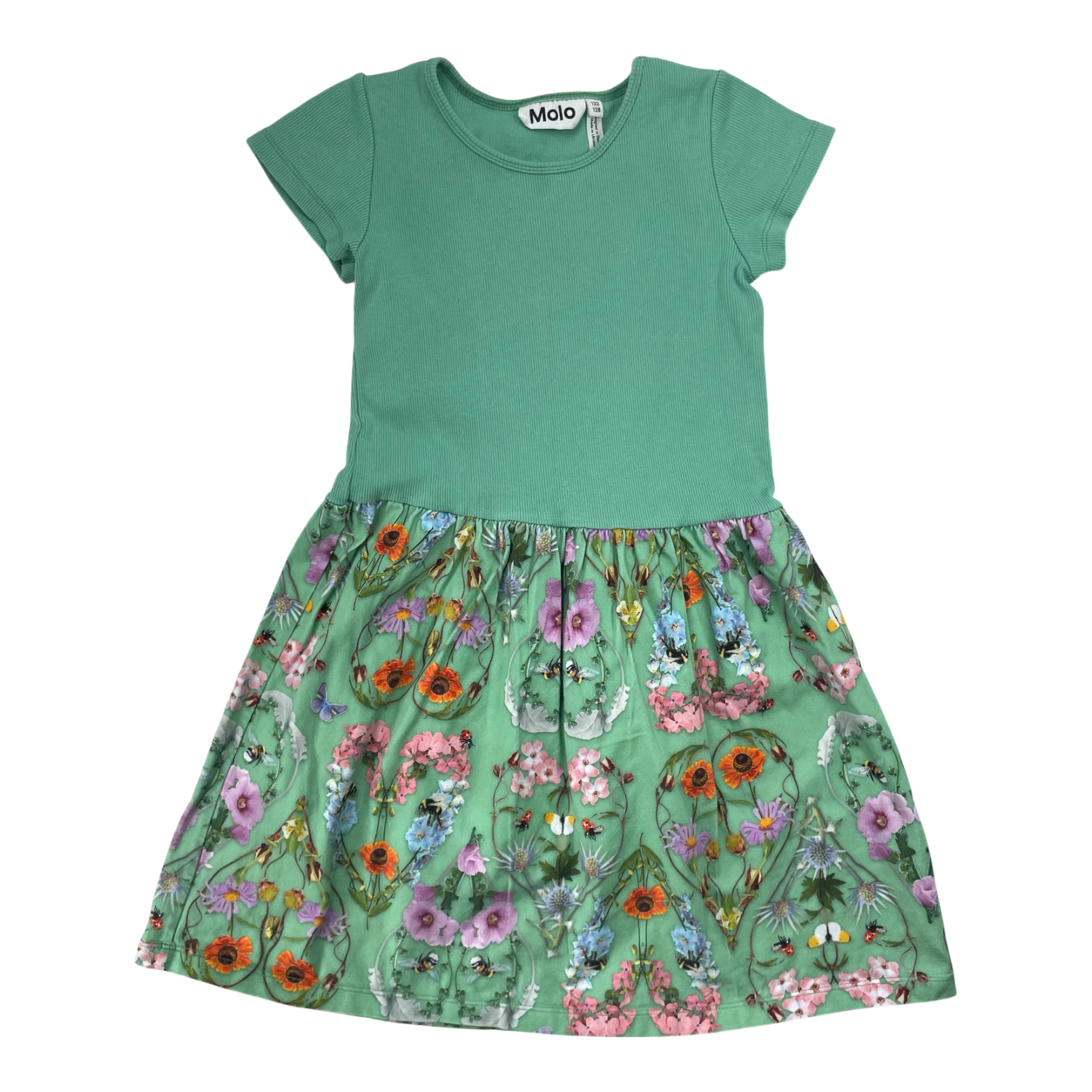Molo short sleeve rib dress with a flower print on the hem. Top is made from rib fabric and the bottom is woven cotton.