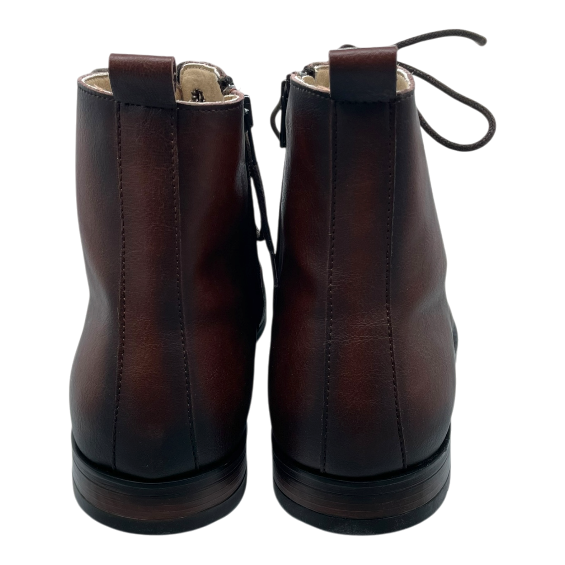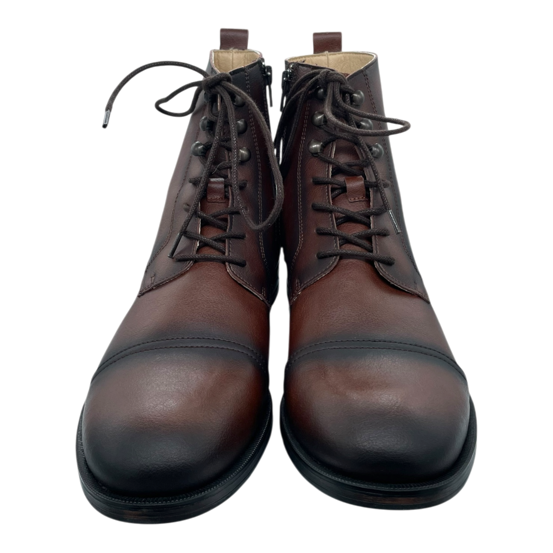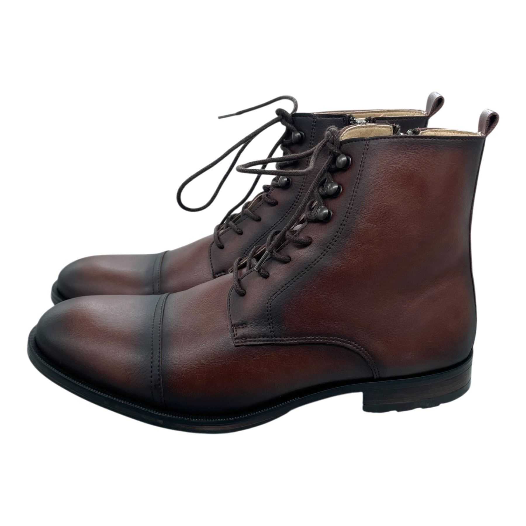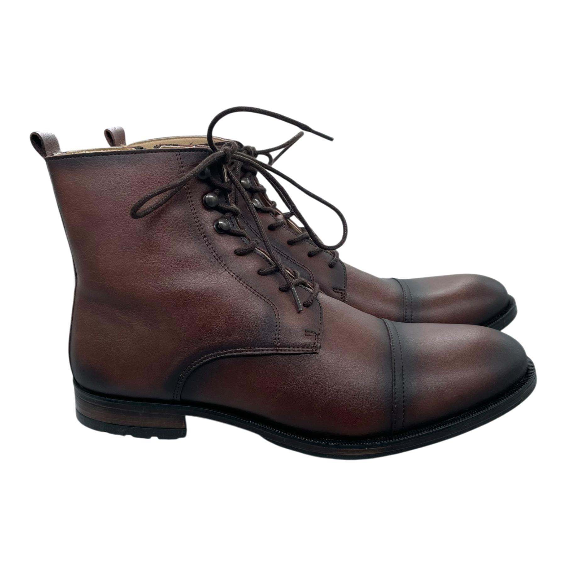 Nae vegan shoes brown leather-style ankle boots with cap toe detail and lace-up closure. Classic dress boot silhouette with pull tabs at heel. Features contrasting black sole and subtle stitching details throughout.