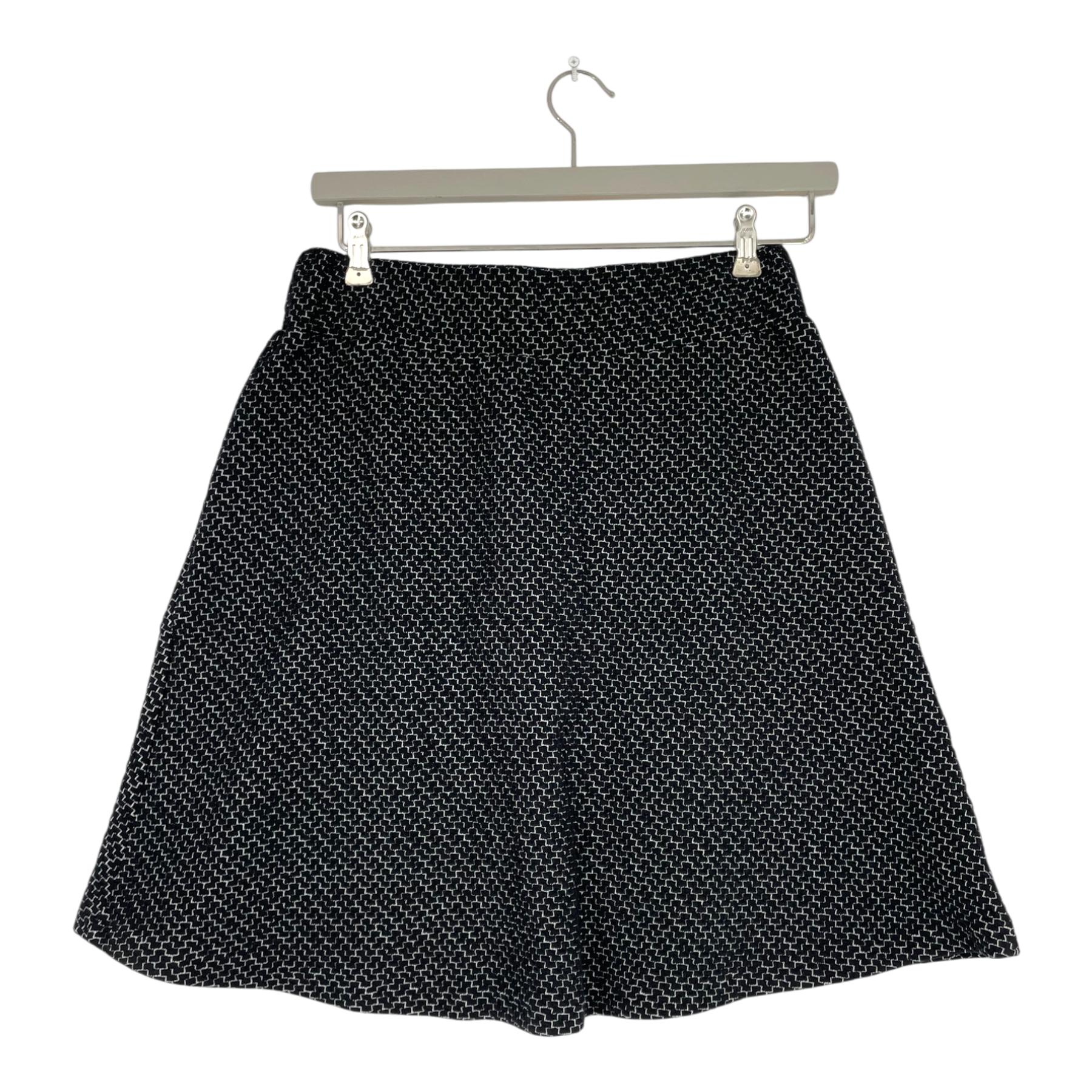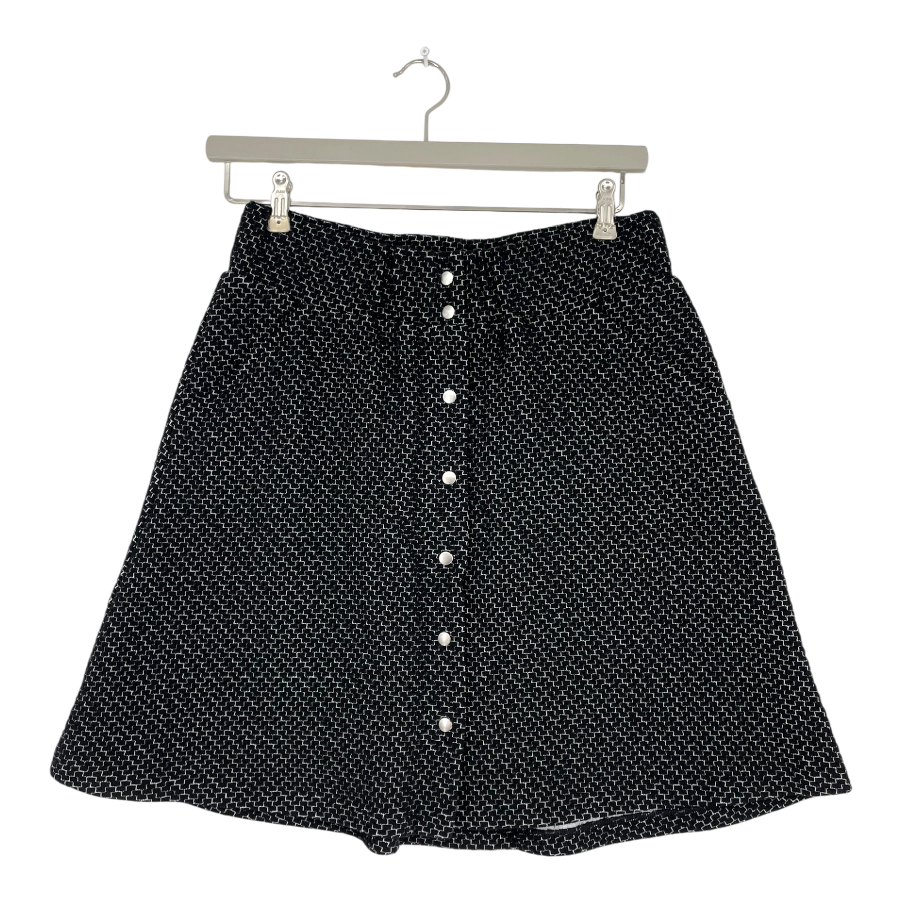 Nouki skirt with pockets on the sides and buttons down the front. The fabric has an abstract knit pattern and contrasting white thread throughout.