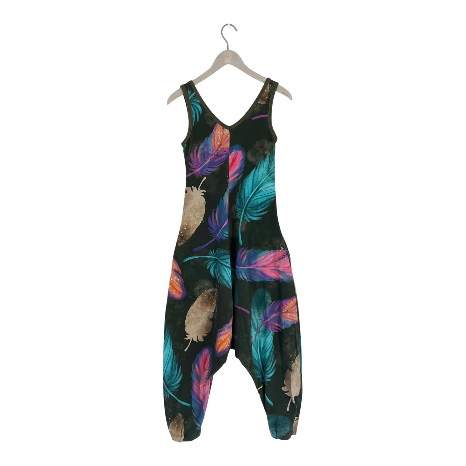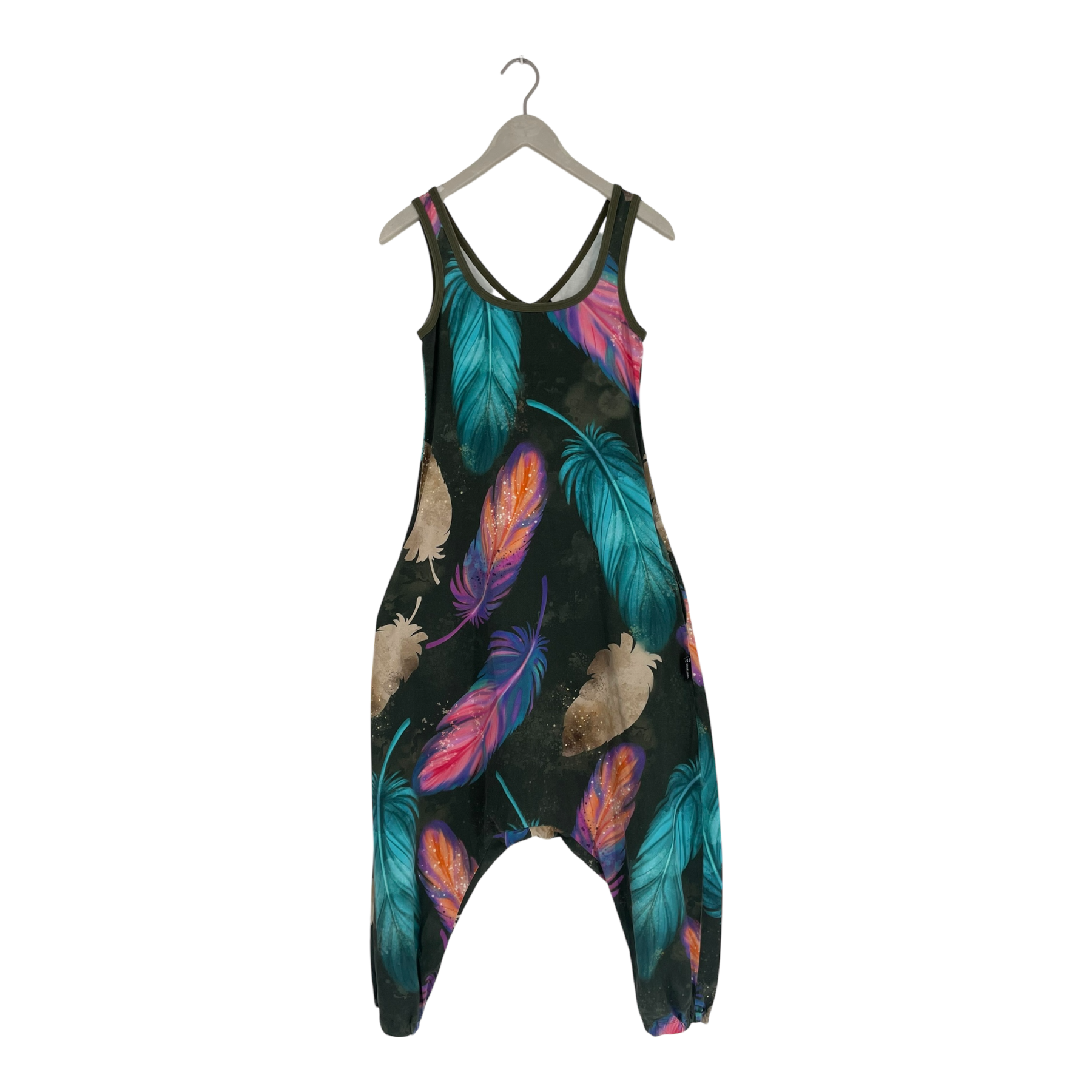 Ommellinen harem sleeveless jumpsuit in feather print with side pockets.