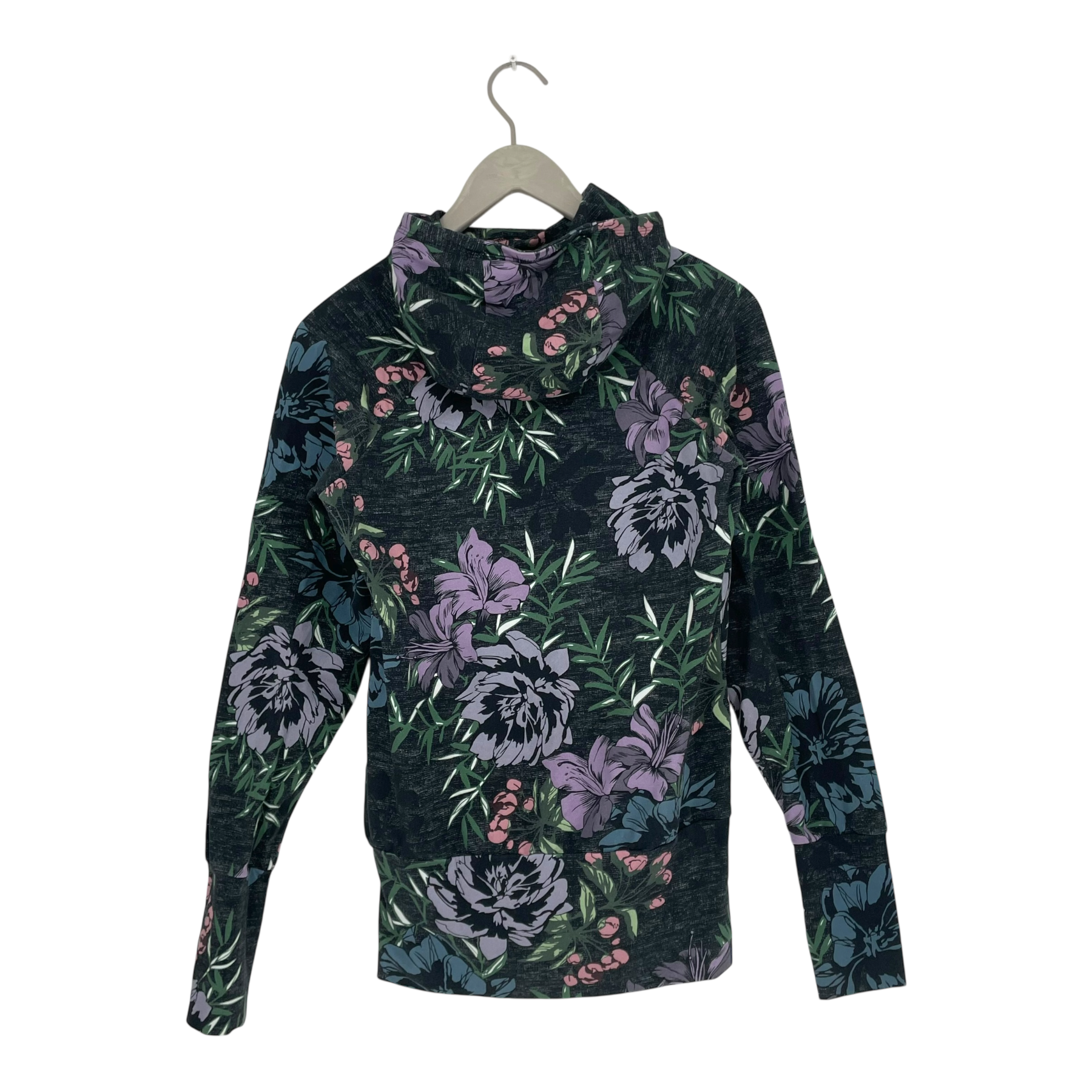 Ommellinen peukku hoodie in the Atsalea floral print. This sweater features a high collar, long raglan sleeves with thumbholes, and a straight hem. The base fabric has a dark marled texture.
