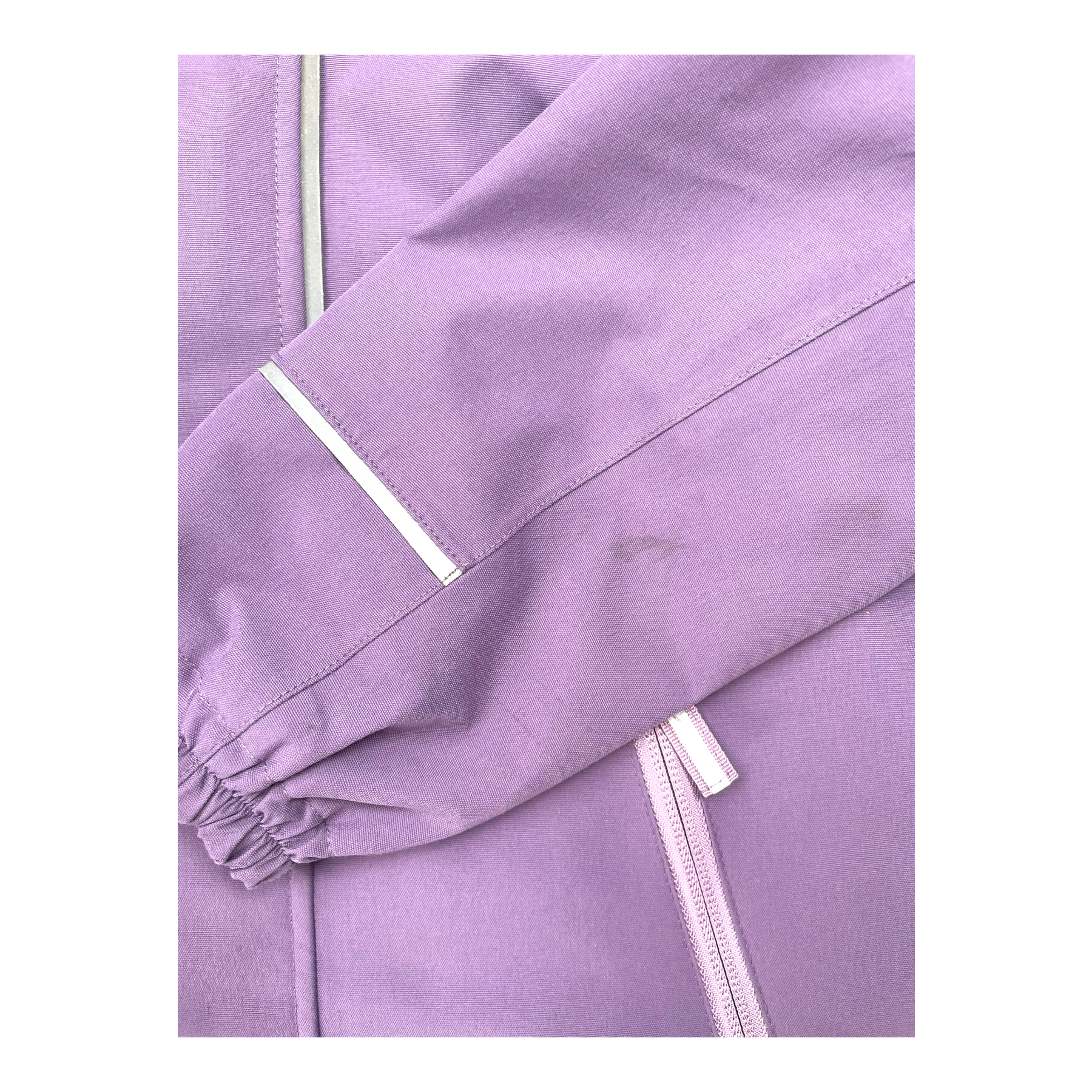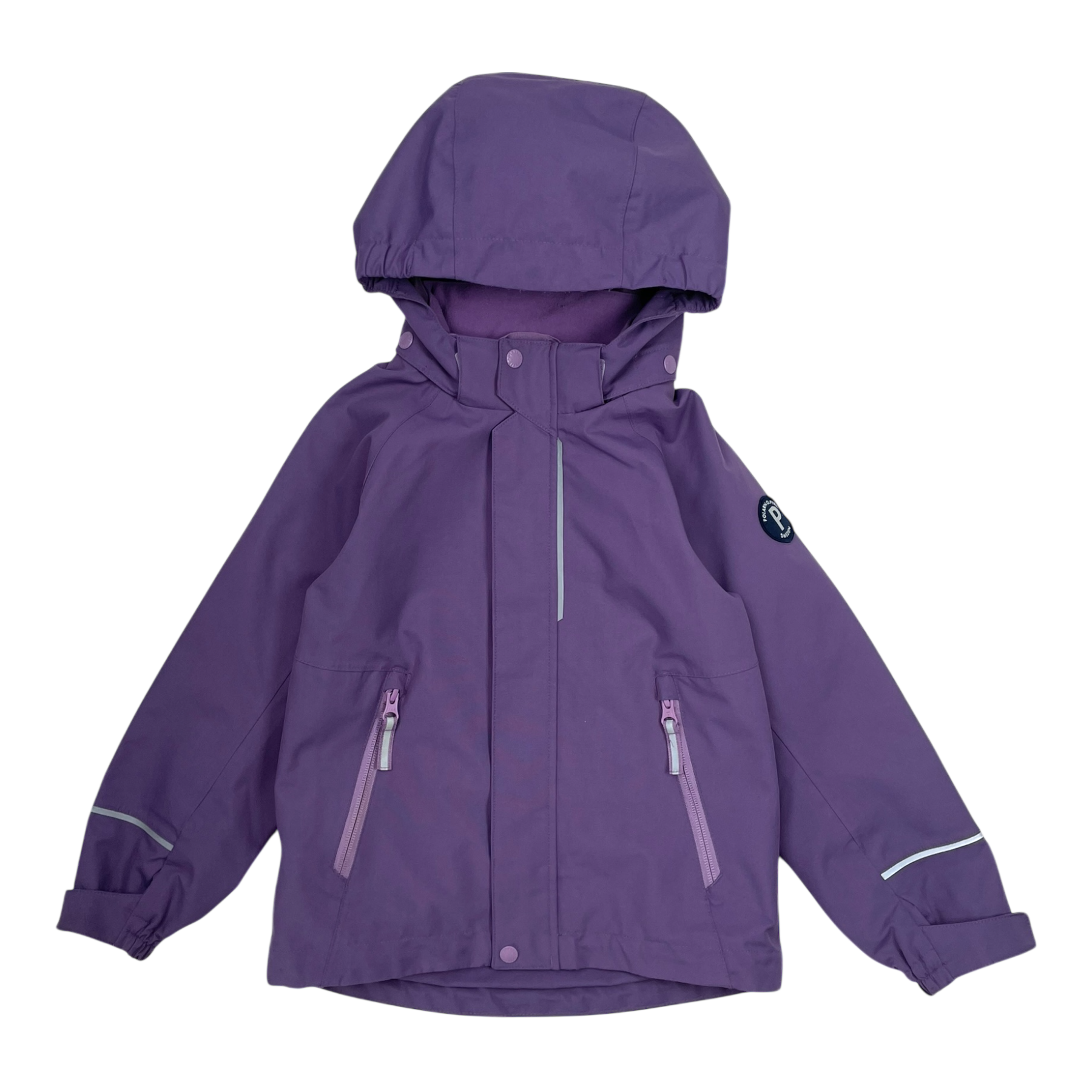 Polarn O. Pyret midseason jacket with detachable hood, zip pockets on sides, and adjustable elastic on the hem. The jacket has reflective details and adjustable cuff ends.