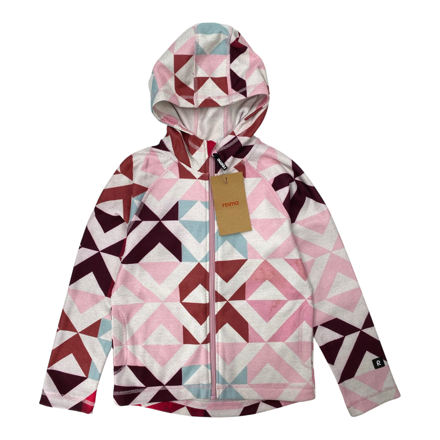Reima Haave fleece jacket with zipper closure and two open pockets in geometric print.