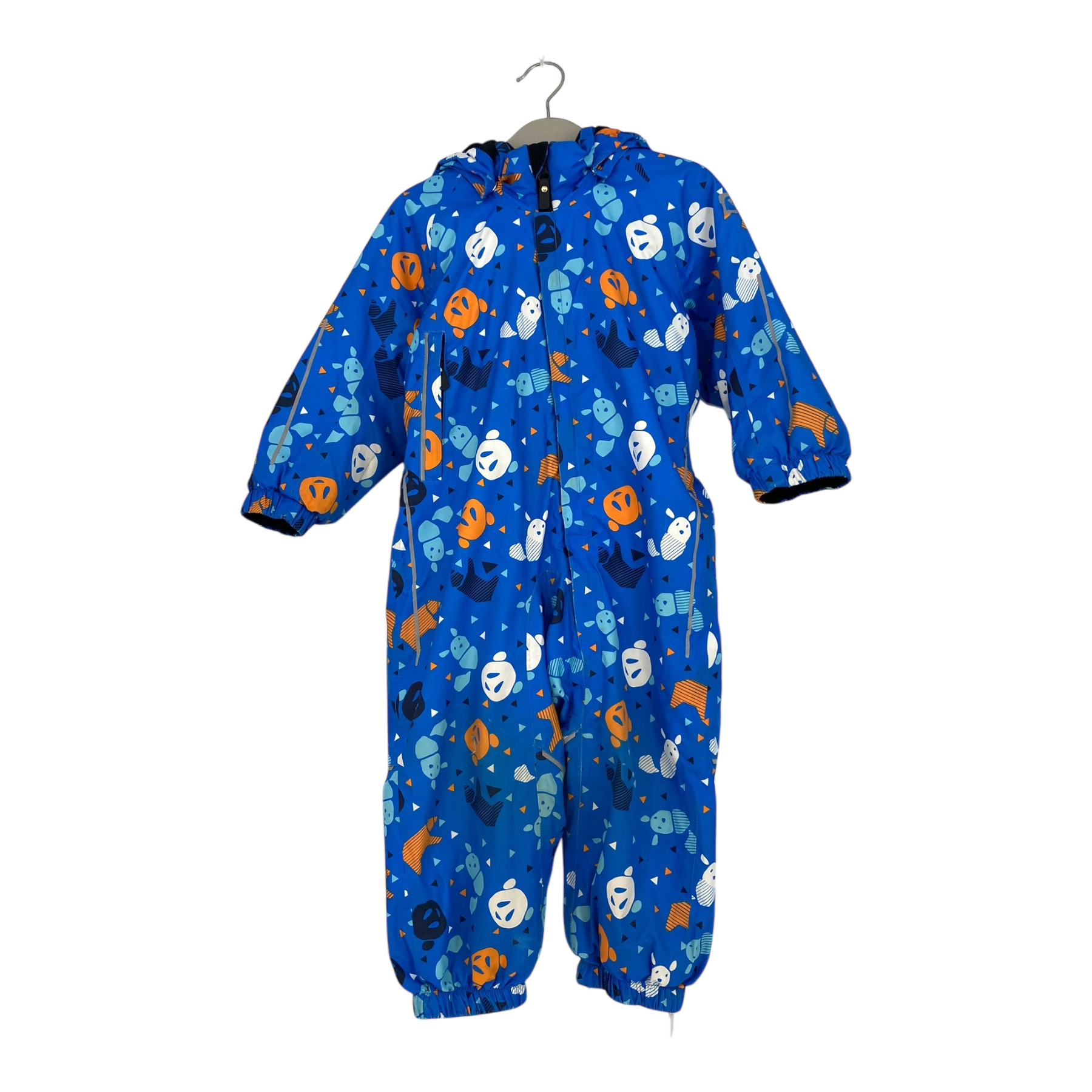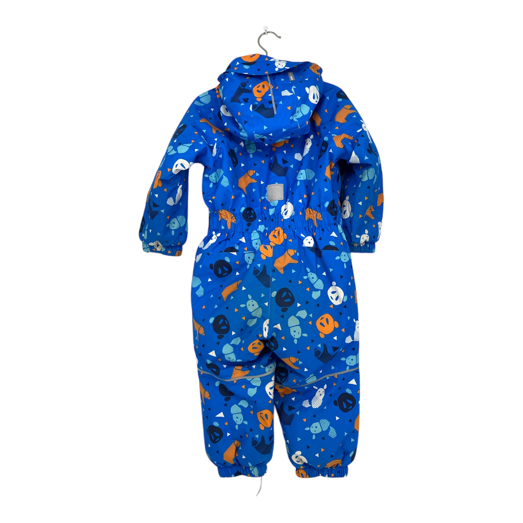 Reima Moomin Lyster overall in winter Moomin print. Overall has a removable hood, long zipper closure, and elastic on the waist. Rubber foot loops (one is missing), one chest pocket and reflective details. Fabric is originally waterproof to 10,000 water column,.