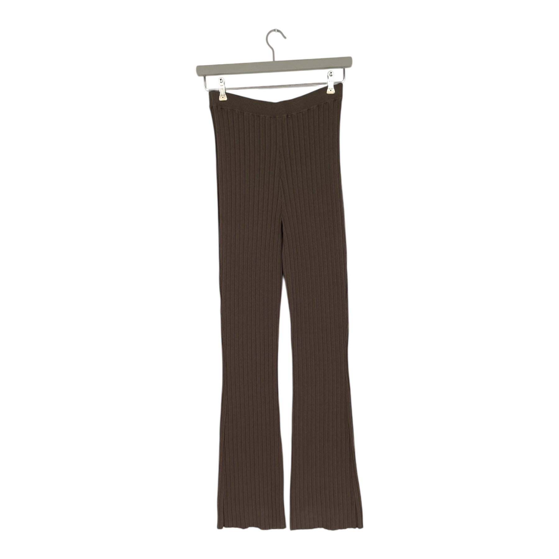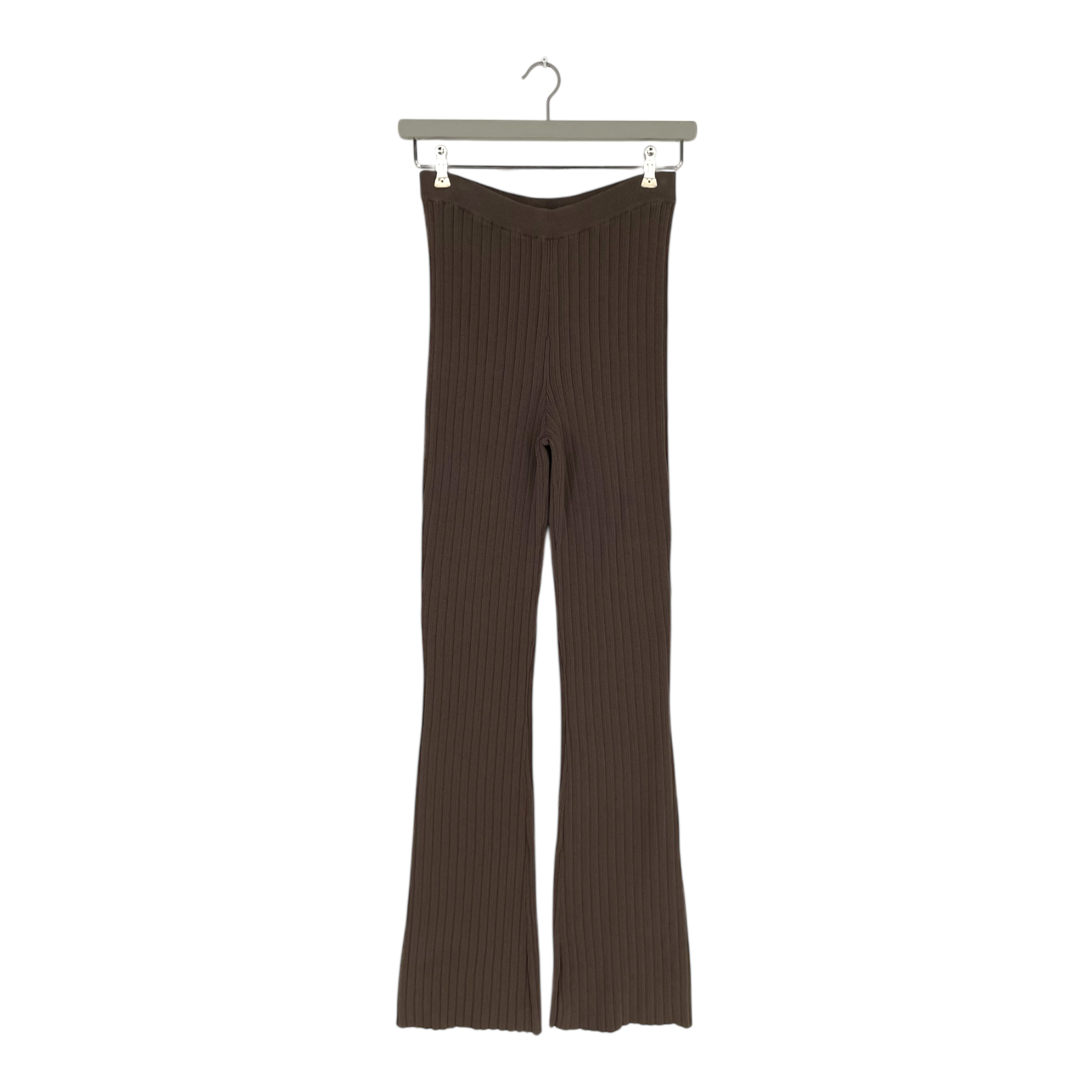 The Samsøe Samsøe Joan trousers in brown are women’s pants made from a stretchy knit fabric. They have a slim-fit shape through the hips, wide legs, and an elasticated waistband for comfort.