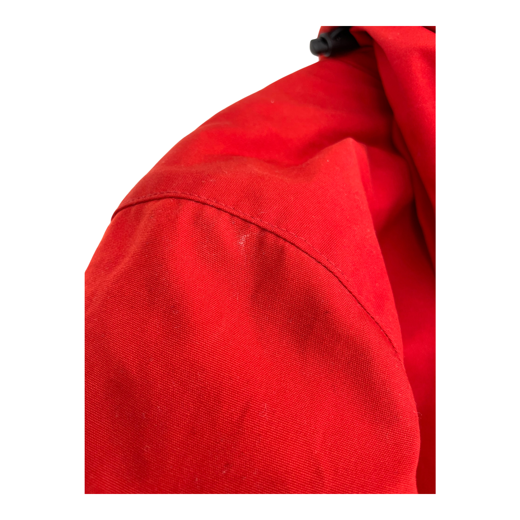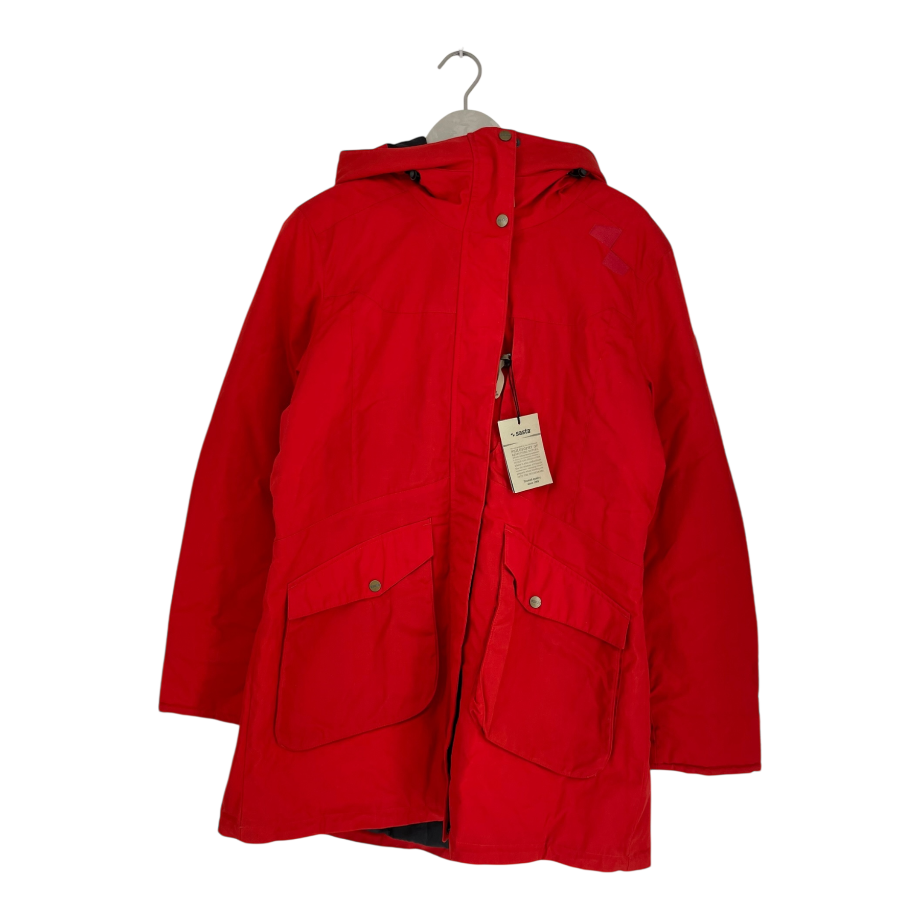 Sasta Lumi winter jacket with zipper closure and wind flap, large hood with string tightening, four pockets and string tightening on the waist as well. The item has lining and wadding and is therefore ideal for cold weather. The pull-tabs of the zippers are leather. The item appears unused, the product tags are still attached.