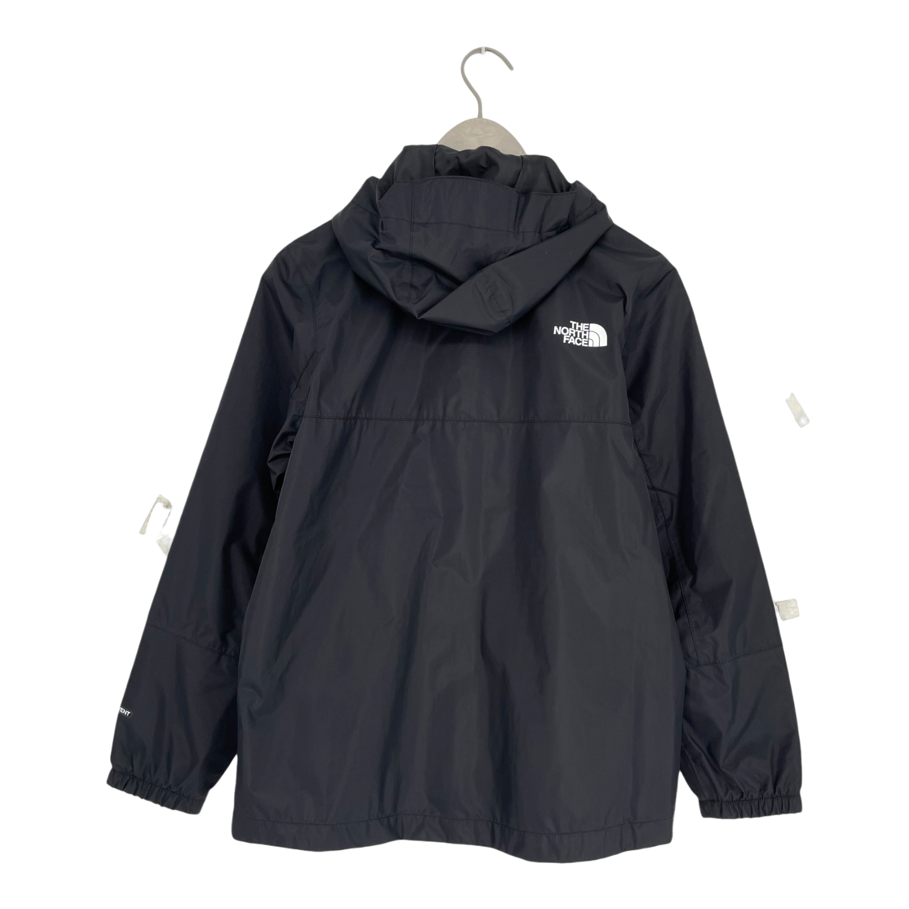 The North Face DryVent waterproof hooded jacket with full zip closure and adjustable hood. Features two front pockets and elastic cuffs. DryVent technology provides waterproof, windproof and breathable protection for outdoor activities.