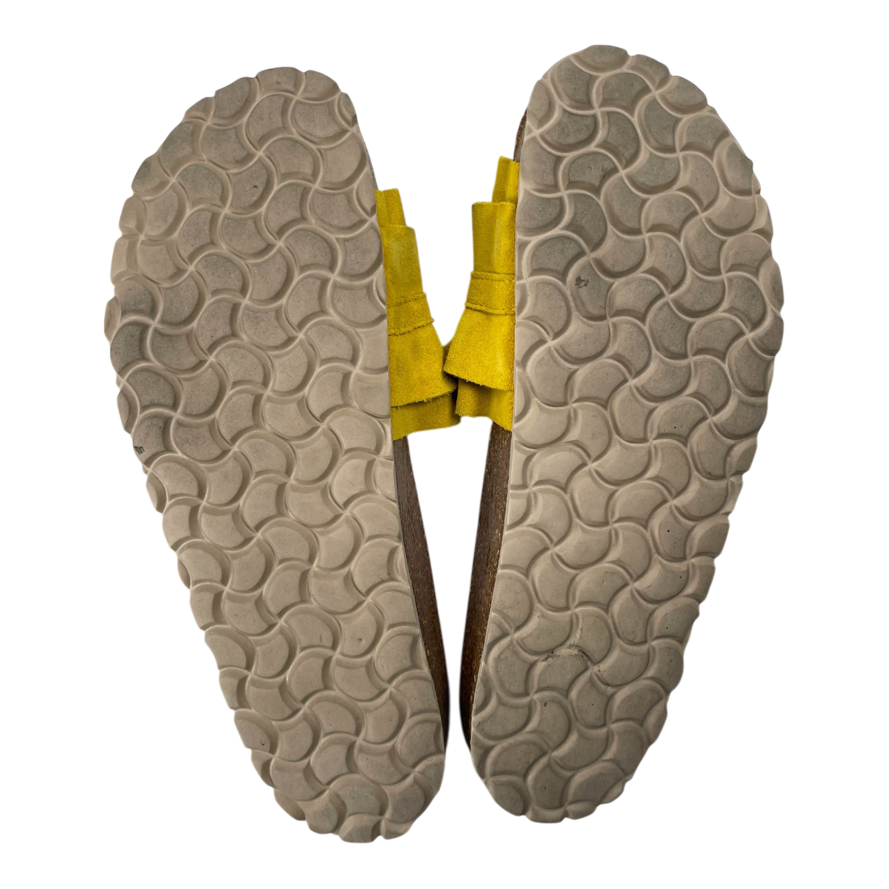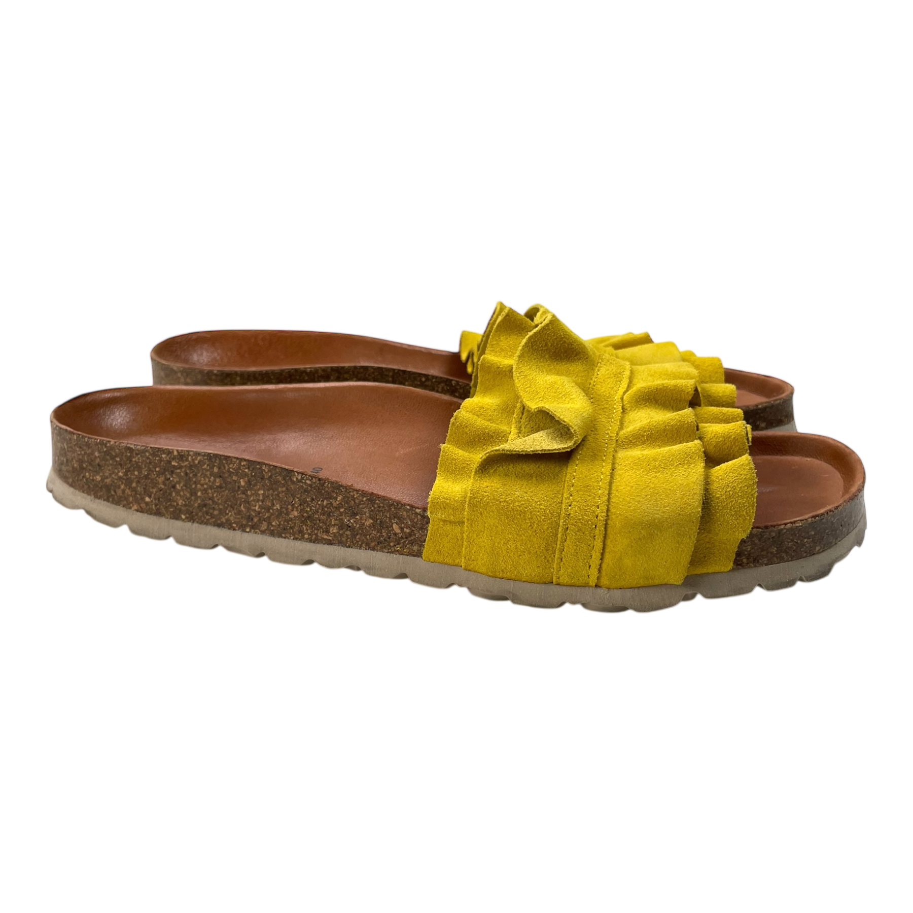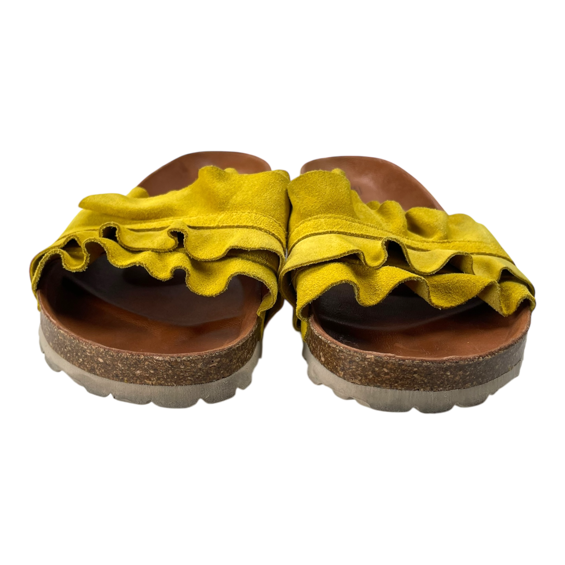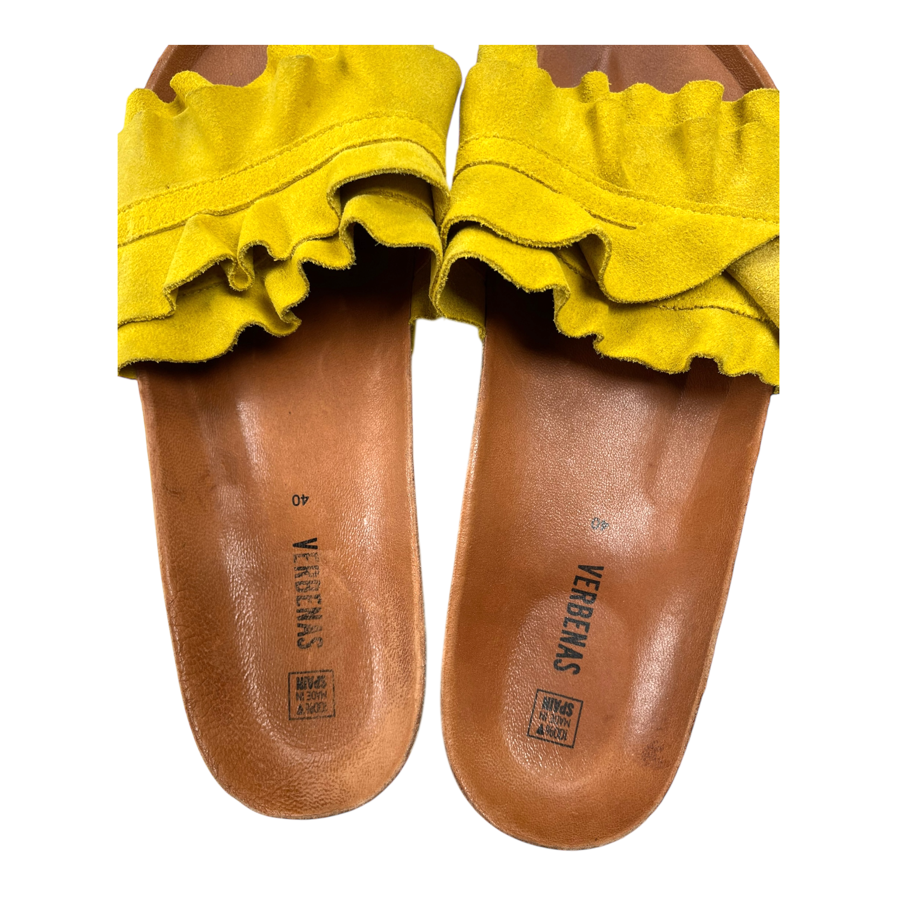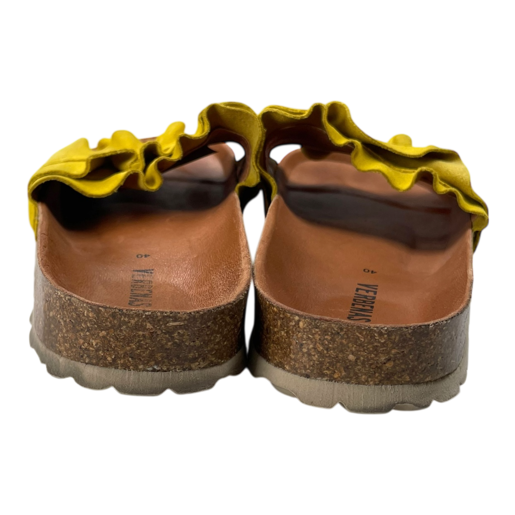 Verbenas Rocío Serraje Volante sandals are the icon of the Verbenas shoe family with their cheery and distinct ruffle design and bright color swatches. The Rocío sandals feature split leather lining and a cork and rubber sole. This pair shows wear especially on the heel part of the sole and on the bottoms, as can be seen from the pictures.