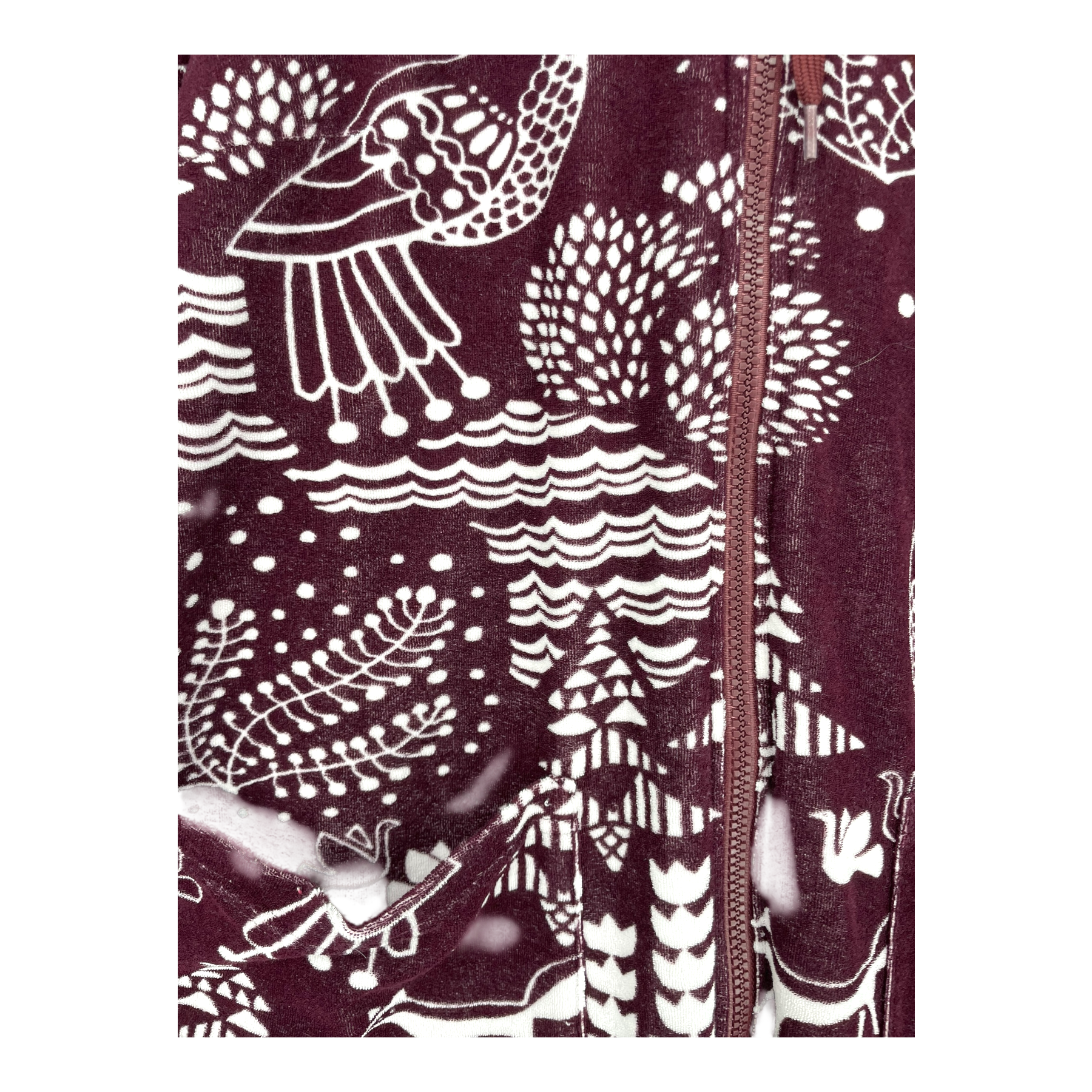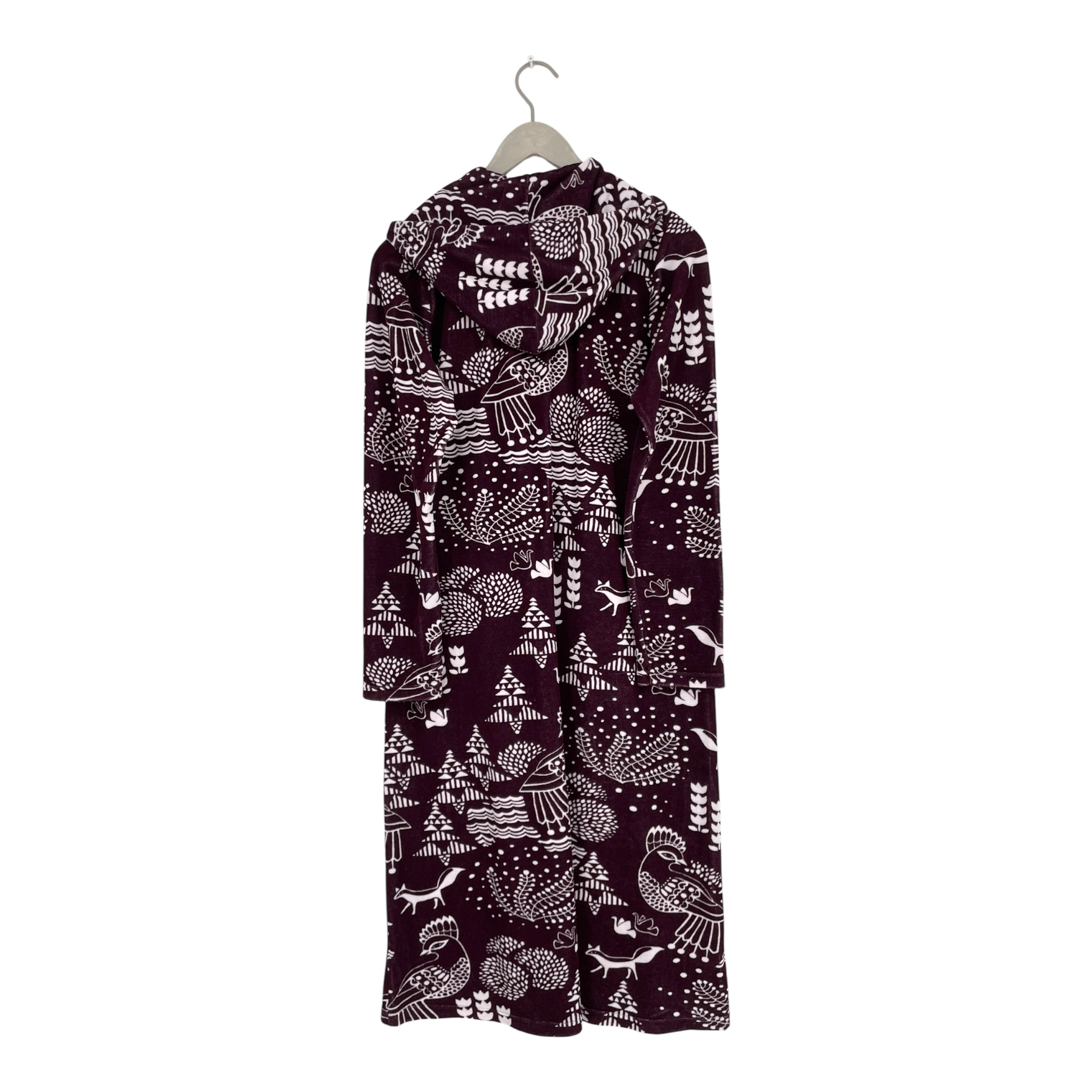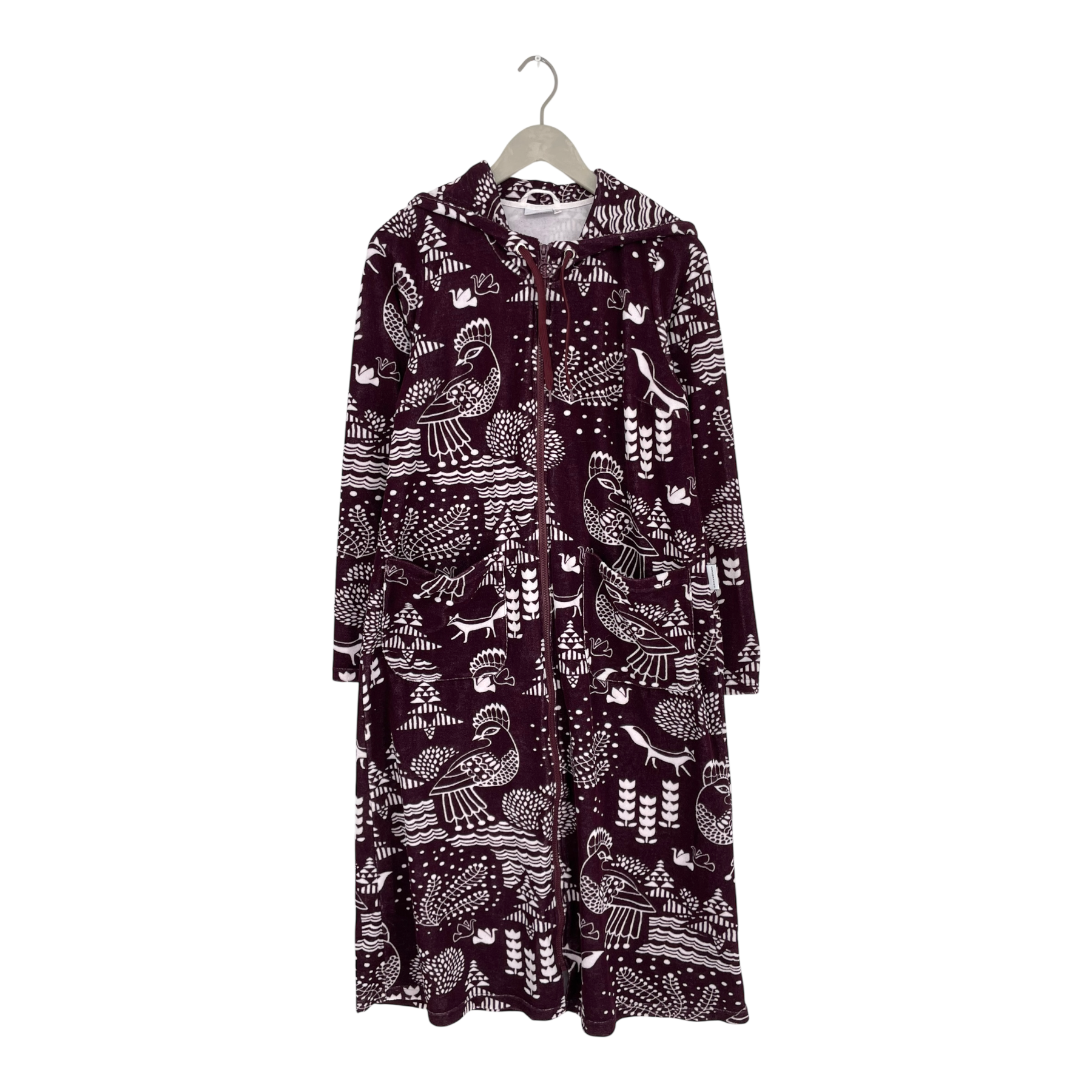 Versonpuoti sauna robe in the Sielulintu design. The sauna robe has a hood, zipper closure and two front pockets. The terry fabric shows signs of wear, as shown in the pictures.